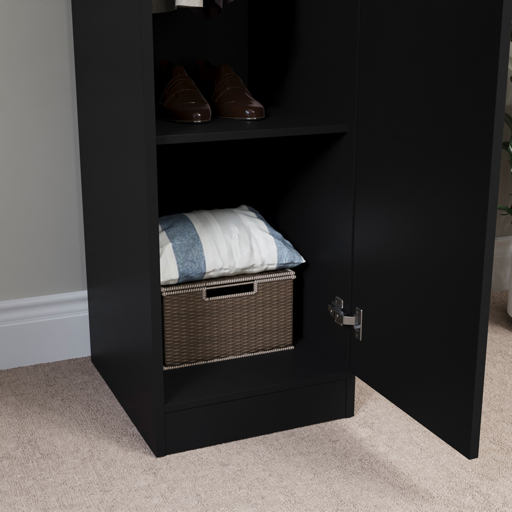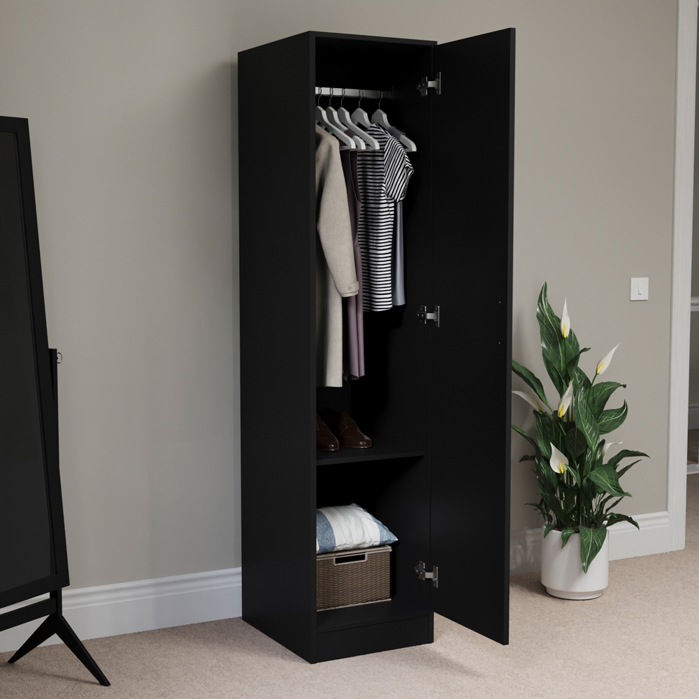 The Riano 1 Door Wardrobe is a compact yet practical storage solution, designed to blend seamlessly with modern interiors. Constructed from sturdy MDF and particleboard with a sleek paper veneer and melamine finish, it combines durability with a clean, contemporary aesthetic. Behind its single door, the wardrobe features a hanging rail, providing an ideal space to keep your clothes organised and crease-free. Below the rail, an integrated shelf offers additional storage for folded clothing, shoes, boxes, or other essentials, making this wardrobe a functional and stylish choice for smaller spaces.