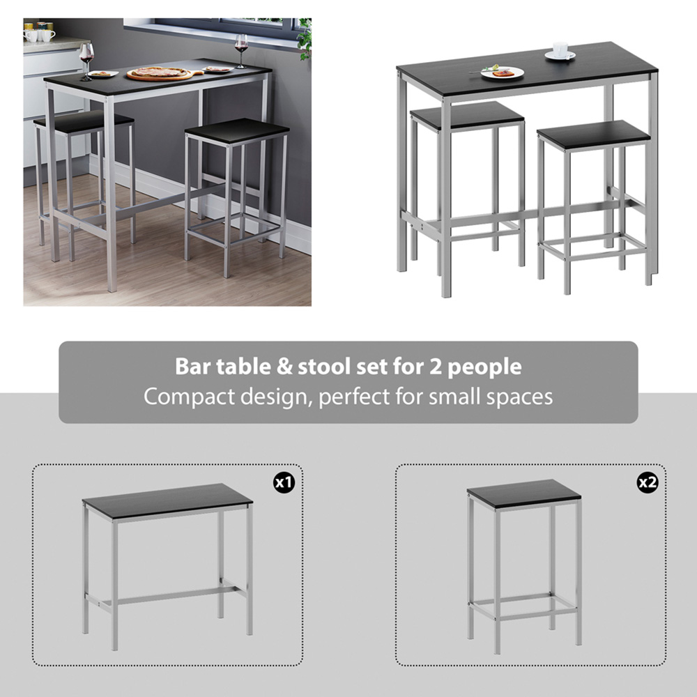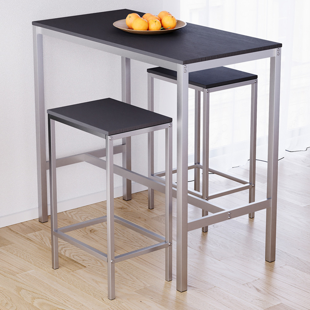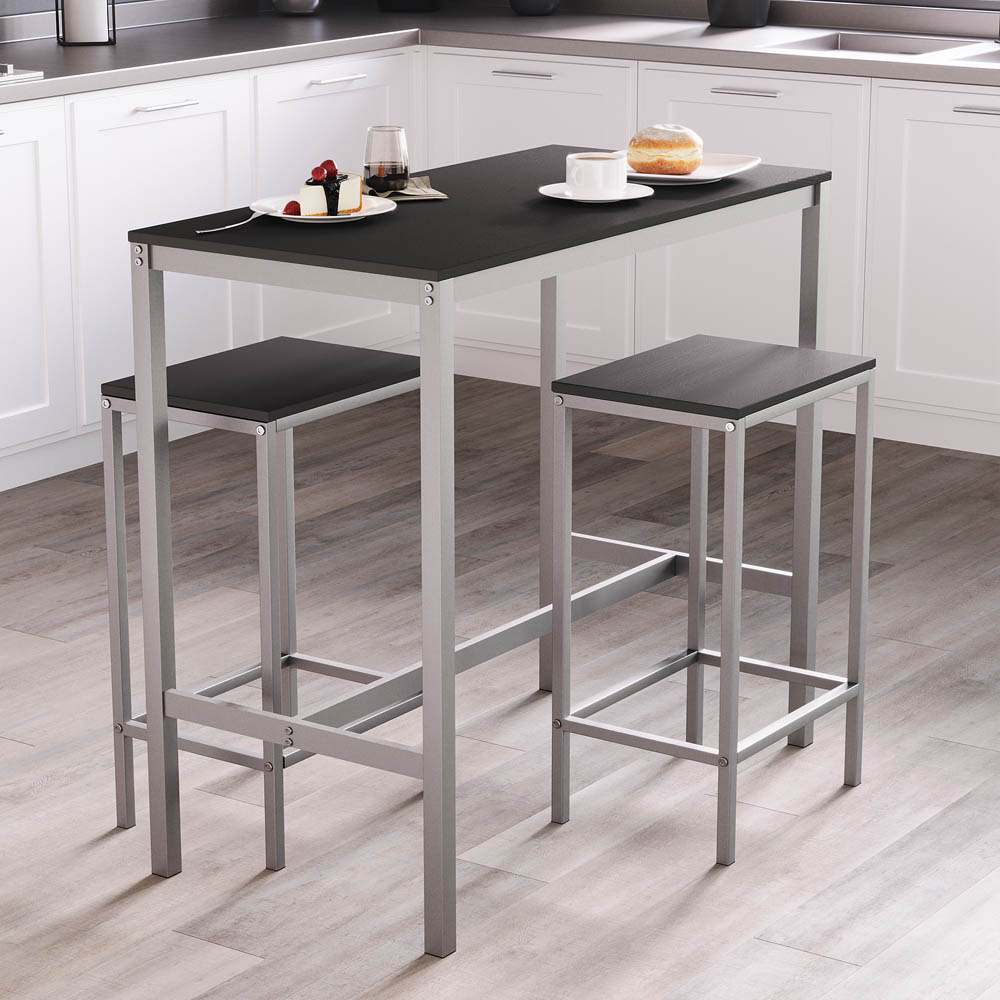 Bring contemporary charm and functional elegance to your home with the Vida Designs Roslyn 2 Seater Metal Frame Breakfast Table Set Black. Designed with a sleek silver metal frame and a warm wood-effect tabletop, this compact bar set is ideal for smaller spaces like apartments, breakfast nooks, or modern kitchens. The high-top table comes paired with two matching stools that slide neatly underneath, maximising your floor space when not in use. Whether you're enjoying a quick coffee or a relaxed dinner for two, the Roslyn set delivers both style and practicality in a compact footprint.