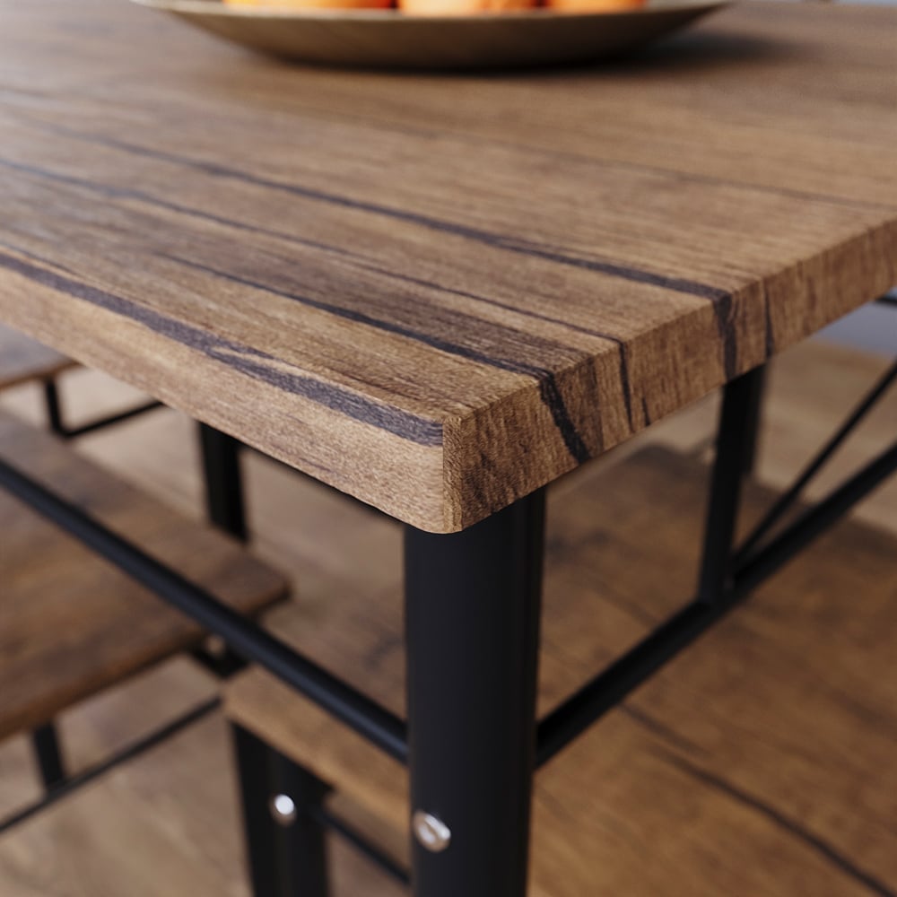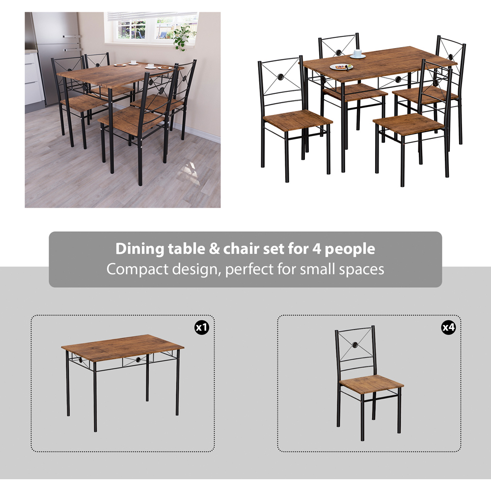 Enhance your dining experience with the Vida Designs Roslyn 4 Seater Dining Set Dark Wood. This beautiful set has a classic, high-quality design with a solid structure. The table features a rustic-style top ideal for four people. This set includes four chairs with comfortable seats, firm backrests and sturdy legs for stability and support. This set is meticulously crafted using solid MDF with powder-coated steel construction for durability and longevity. This set has a timeless design suitable for all types of modern and traditional interior spaces. The maximum weight limit of the table is 50kg and the maximum weight limit of a single chair is 100kg. This product comes with easy-to-follow instructions for self-assembly. Please note: Due to different devices and screen settings, the colour of the webpage picture you see may have a certain colour difference from the actual product. Table size: 70 x 110 x 77cm. Chair size: 48 x 42 x 88cm.