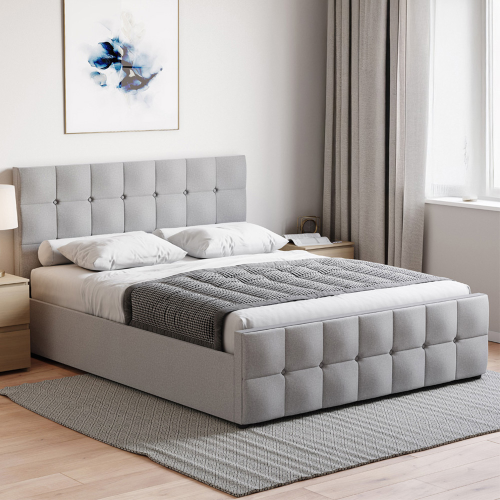 Introducing the Valentina Ottoman Bed from Vida Designs, a stunning and practical addition to your bedroom that combines luxurious design with convenient storage solutions. Upholstered in exquisite linen, this bed exudes opulence and adds a touch of elegance to your sleeping sanctuary. The bed showcases a modern aesthetic with its clean lines and sleek silhouette, effortlessly enhancing any contemporary bedroom decor. The ottoman design allows for easy and convenient access to the spacious under-bed storage compartment. This hidden storage area is perfect for stowing away extra bedding, pillows, or other items, helping you maintain a clutter-free and organized bedroom. Designed with your comfort in mind, the bed features a slatted base that provides excellent support for your mattress. The slats ensure proper air circulation, promoting a healthier sleep environment and prolonging the lifespan of your mattress. Plus, its assembly is simple with the included instructions and hardware. Whether you're looking for a stylish upgrade or a practical storage solution, this bed will transform your bedroom into a haven of comfort and style. Size: Double. Material: MDF, Steel, Plywood and 100% Polyester. Weight Limit: 200kg. Note: This item requires self-assembly with easy-to-follow instructions provided. The actual colour of the product may vary slightly as your screen display setting and lighting in your home environment may differ.