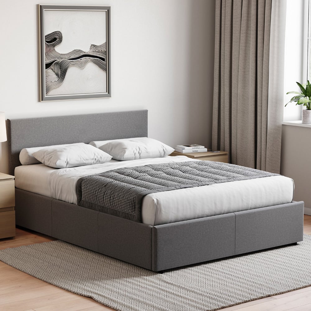 A perfect fusion of style and functionality, the Veronica Ottoman Fabric Bed from Vida Designs will transform your bedroom into a haven of comfort and organization. This ottoman bed features a sleek and contemporary design with a hidden storage compartment, offering both comfortable sleeping space and a practical solution for keeping your bedroom clutter-free. Crafted with meticulous attention to detail, the bed comes with a sturdy platform base and wooden slats, providing optimal support for your mattress. The wooden slats ensure a stable and even sleep surface, enhancing the overall comfort of your bed. What sets this bed apart is its ingenious storage design. Lift the slatted base, and you'll discover a spacious storage compartment underneath, perfect for stashing away extra bedding, seasonal clothing, or any items you wish to keep neatly tucked away. The fabric upholstery adds a touch of elegance and softness to the bed, creating a cosy and inviting atmosphere in your bedroom. The neutral fabric colour complements a variety of decor styles, making it a versatile and timeless addition to any room. Size: Double. Material: MDF, Steel, Plywood and 100% Polyester. Finish: Linen Effect. Weight Limit: 180kg. Note: This item requires self-assembly with easy-to-follow instructions provided. The actual colour of the product may vary slightly as your screen display setting and lighting in your home environment may differ.