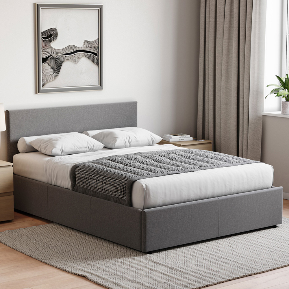 A perfect fusion of style and functionality, the Veronica Ottoman Fabric Bed from Vida Designs will transform your bedroom into a haven of comfort and organization. This ottoman bed features a sleek and contemporary design with a hidden storage compartment, offering both comfortable sleeping space and a practical solution for keeping your bedroom clutter-free. Crafted with meticulous attention to detail, the bed comes with a sturdy platform base and wooden slats, providing optimal support for your mattress. The wooden slats ensure a stable and even sleep surface, enhancing the overall comfort of your bed. What sets this bed apart is its ingenious storage design. Lift the slatted base, and you'll discover a spacious storage compartment underneath, perfect for stashing away extra bedding, seasonal clothing, or any items you wish to keep neatly tucked away. The fabric upholstery adds a touch of elegance and softness to the bed, creating a cosy and inviting atmosphere in your bedroom. The neutral fabric colour complements a variety of decor styles, making it a versatile and timeless addition to any room. Size: King. Material: MDF, Steel, Plywood and 100% Polyester. Finish: Linen Effect. Weight Limit: 180kg. Note: This item requires self-assembly with easy-to-follow instructions provided. The actual colour of the product may vary slightly as your screen display setting and lighting in your home environment may differ.
