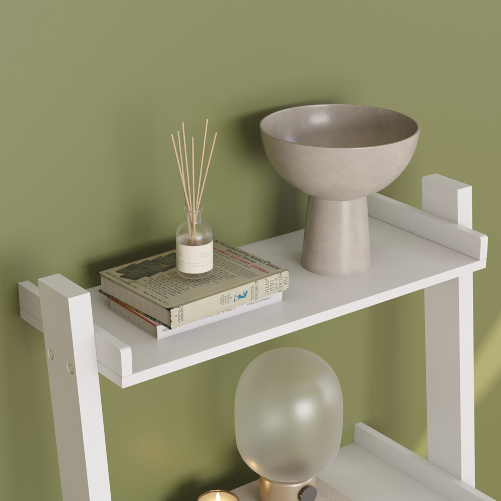 Create ample storage and display space at your home with Vida York 3-Tier Ladder Bookcase. Featuring a white finish that complements any decor style - it is the perfect solution for organizing and displaying your books, decorative items, and other essentials. The lightweight construction makes it easy to move from room to room - while the compact size means that it won't take up too much space. The sturdy ladder-style frame provides stability, and the wide base ensures that the bookcase won't tip over. Whether you're looking to declutter your living space this bookcase is a perfect choice.