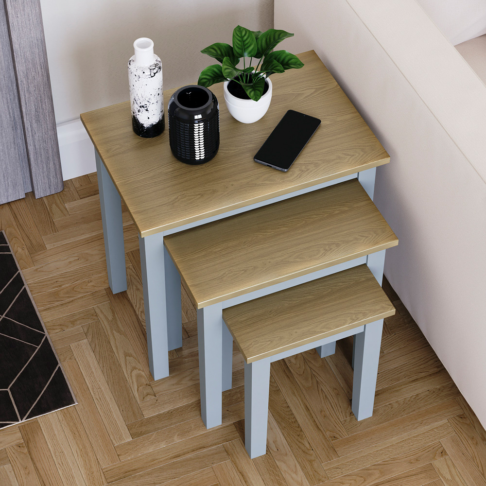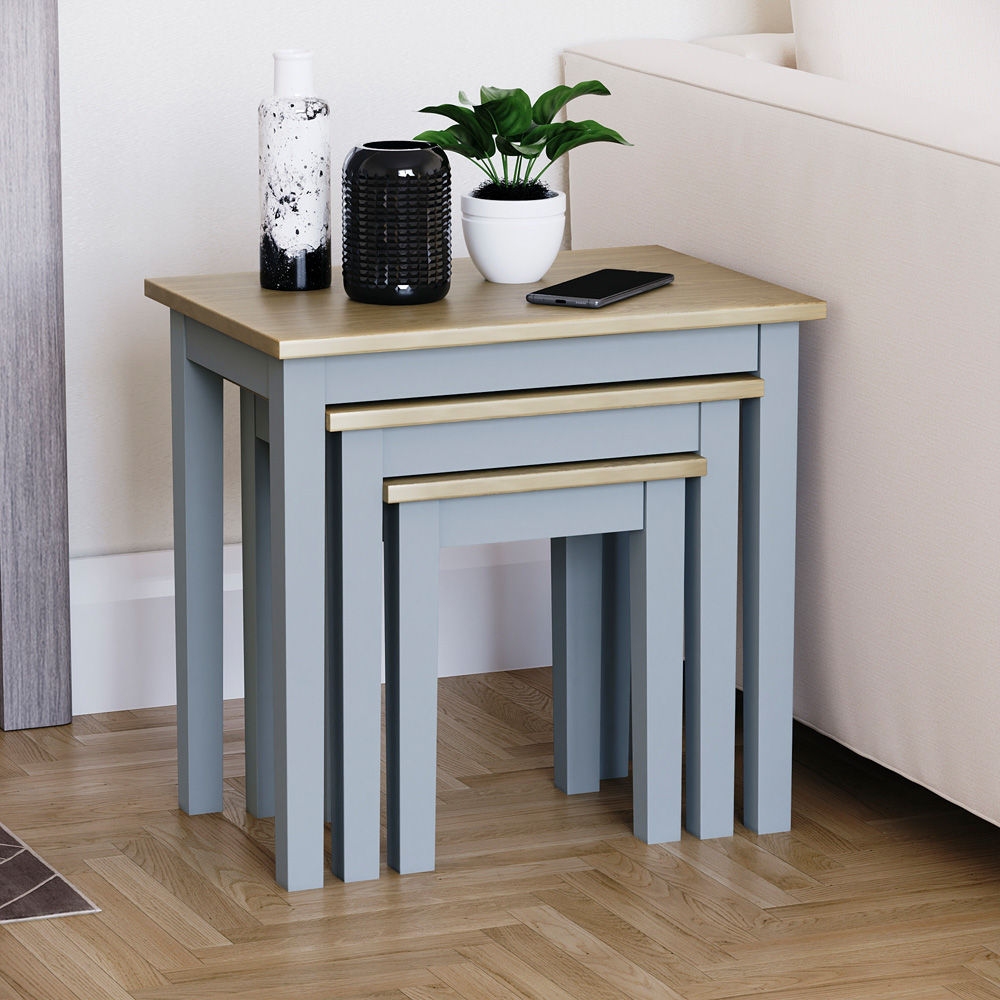 Make a beautiful addition to your living space with this Vida Designs Yorkshire Oak and Grey Nest of Tables Set of 3. Crafted with utmost precision, this three-piece set features a classic design which seamlessly blends into any living space, adding a touch of sophistication. Each table within the set is thoughtfully designed to complement the others, creating a harmonious nesting arrangement that is both space-saving and visually appealing. The simplicity of the design allows these tables to effortlessly integrate into various home aesthetics, from traditional to modern, making them a versatile addition to your furniture ensemble. Constructed with quality MDF, these tables boast durability that goes hand in hand with their aesthetic charm. The weight limit for each table is small – ten kg, medium – 20kg, and large – 30kg. Whether enjoying a cosy evening with friends or seeking a practical solution for everyday living, these tables are the epitome of understated sophistication. Please note - The product's actual colour may vary slightly as your screen display setting and lighting with your home environment may differ. Also, it requires self-assembly and comes with easy-to-follow instructions. Measurements: large table: H46 x W48 x D33cm, medium table: H39.5 x W37 x D29cm, small table: H33.5 x W27 x D25cm.