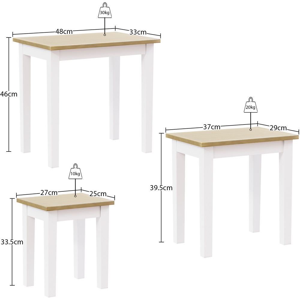 Make a beautiful addition to your living space with this Vida Designs Yorkshire Oak and White Nest of Tables Set of 3. Crafted with utmost precision, this three-piece set features a classic design which seamlessly blends into any living space, adding a touch of sophistication. Each table within the set is thoughtfully designed to complement the others, creating a harmonious nesting arrangement that is both space-saving and visually appealing. The simplicity of the design allows these tables to effortlessly integrate into various home aesthetics, from traditional to modern, making them a versatile addition to your furniture ensemble. Constructed with quality MDF, these tables boast durability that goes hand in hand with their aesthetic charm. The weight limit for each table is small – ten kg, medium – 20kg, and large – 30kg. Whether enjoying a cosy evening with friends or seeking a practical solution for everyday living, these tables are the epitome of understated sophistication. Please note - The product's actual colour may vary slightly as your screen display setting and lighting with your home environment may differ. Also, it requires self-assembly and comes with easy-to-follow instructions. Measurements: large table: H46 x W48 x D33cm, medium table: H39.5 x W37 x D29cm, small table: H33.5 x W27 x D25cm.