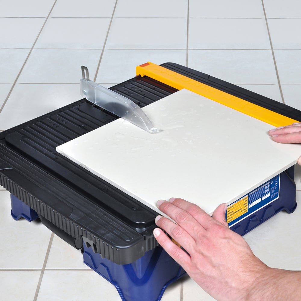 Cut tiles easily and efficiently with this tile cutter from Vitrex. Featuring adjustable double-extension arms, it can easily support large format tiles. This tile cutter also features a tilting cutting table, a water-cooling system, and a transparent wheel guard with adjustable height, helping you work easily and safely.