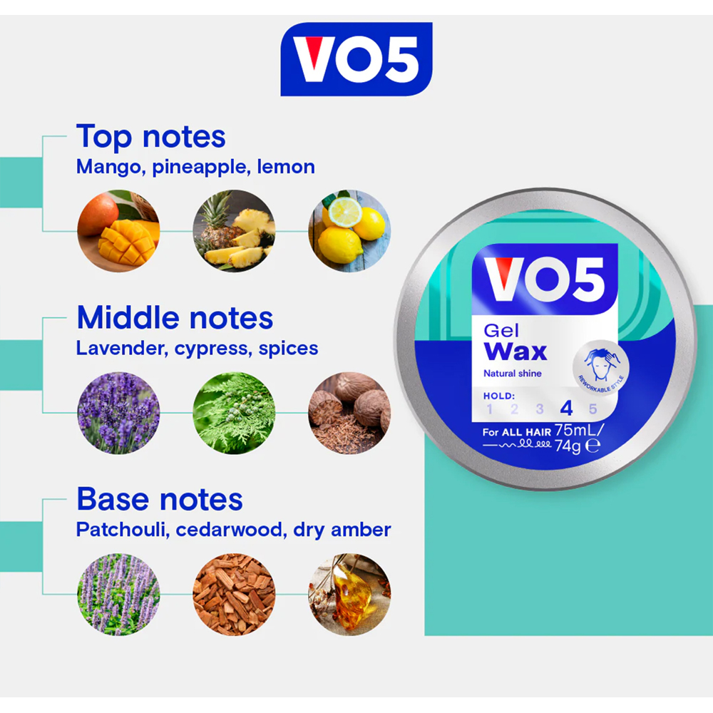 VO5 Extra Hold Gel Wax for Natural Shine and Shapes 75ml, 3 Pack. Give your hair the perfect form with Vo5 Gel Wax. This versatile product is perfect for short to mid-length neat cuts, while also being non-greasy and non-crunchy. Just right to create your own natural style. It gives you hold, definition, and natural shine and is easy to work in and wash out with a hold level of 5/5. Vo5 Gel Wax is a versatile product and is ideal for creating either daytime or evening styles. Use the gel wax sparingly, as a little of the product goes a long way. Add more if needed. If you liked Vo5 Gel Wax, be sure to check out the other Vo5 styling products in the full range like our Hair Fibre, Hair Paste, or Hair Putty to remix your style and experiment with your hair even further. Don't forget to leave a product review and share your very best hair styling tips and tricks.