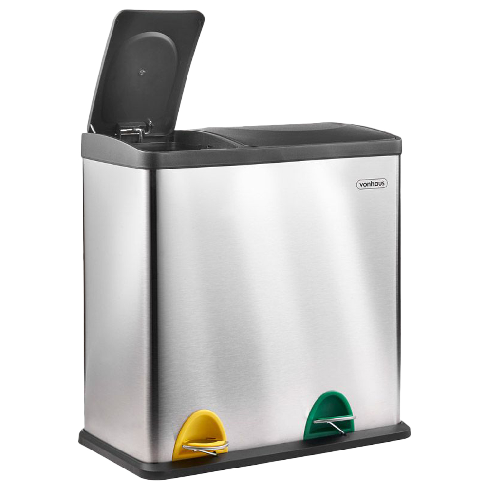 Transform your kitchen functionality with the VonHaus 2 in 1 Steel Recycling Pedal Bin 36L. This two-compartment recycling bin makes disposing of waste and consistent recycling an easy task. It features removable inner bins with chrome-plated handles that help separate your regular and recyclable waste before disposal. This bin is made from durable steel with a modern satin finish to suit any indoor space.