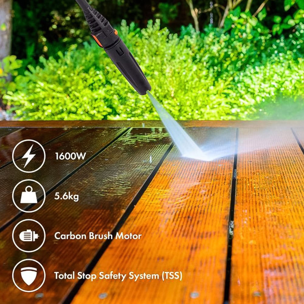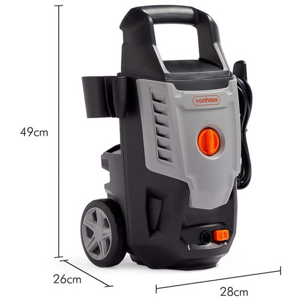 Step into a world of advanced and powerful cleaning with the VonHaus 3500263 Grey Pressure Washer 1600W . Operating at 240V 50Hz, this machine features a robust carbon brush motor equipped with a thermal protector to prevent overheating. With a versatile pressure range of 90 to 130 bar and a water flow rate of 5L to 6.5L per minute, it effectively removes dirt and grime from any surface. This system is extremely safe and instantly shuts down when not in use. Plus, the wobble pump technology allows for self-priming, making it instantly ready to use.