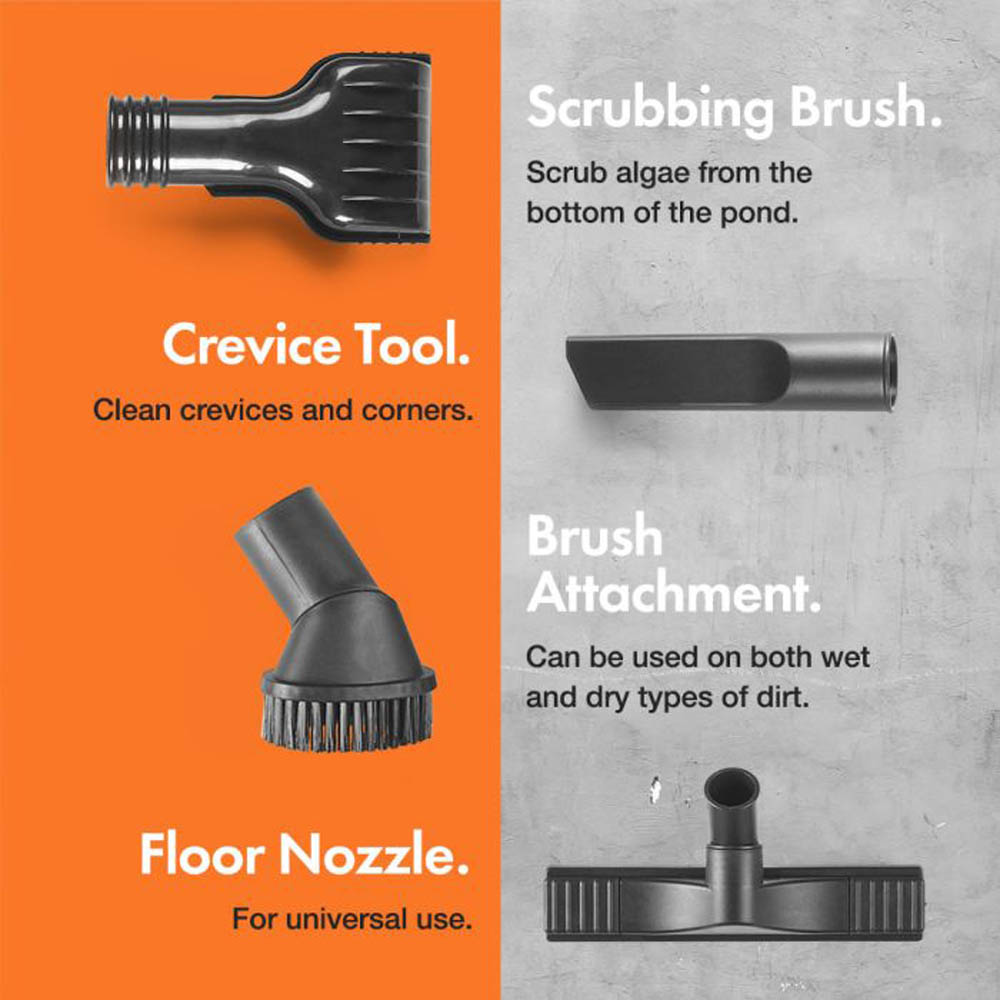 From scrubbing the bottom of your pond until it’s gleaming to ridding your spare room of dust, this wet vacuum cleaner has all the accessories you need. Here’s a quick breakdown of each attachment. Algae brush to scrub algae from the bottom of your pond. Multi-surface brush has a versatile design to suit a wide variety of surfaces. Crevice nozzle offers streamlined shape perfect for getting into hard-to-reach corners. Floor nozzle offers wider design to quickly cover large areas of your floor.