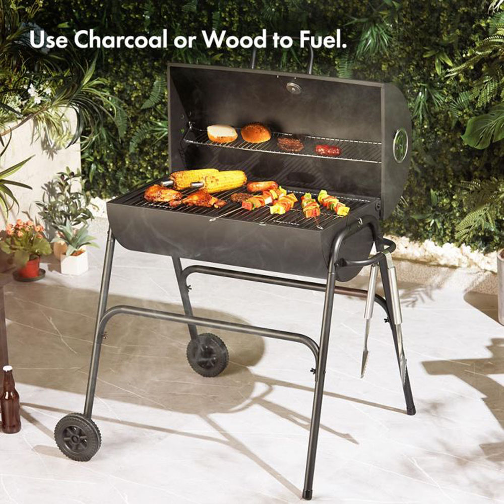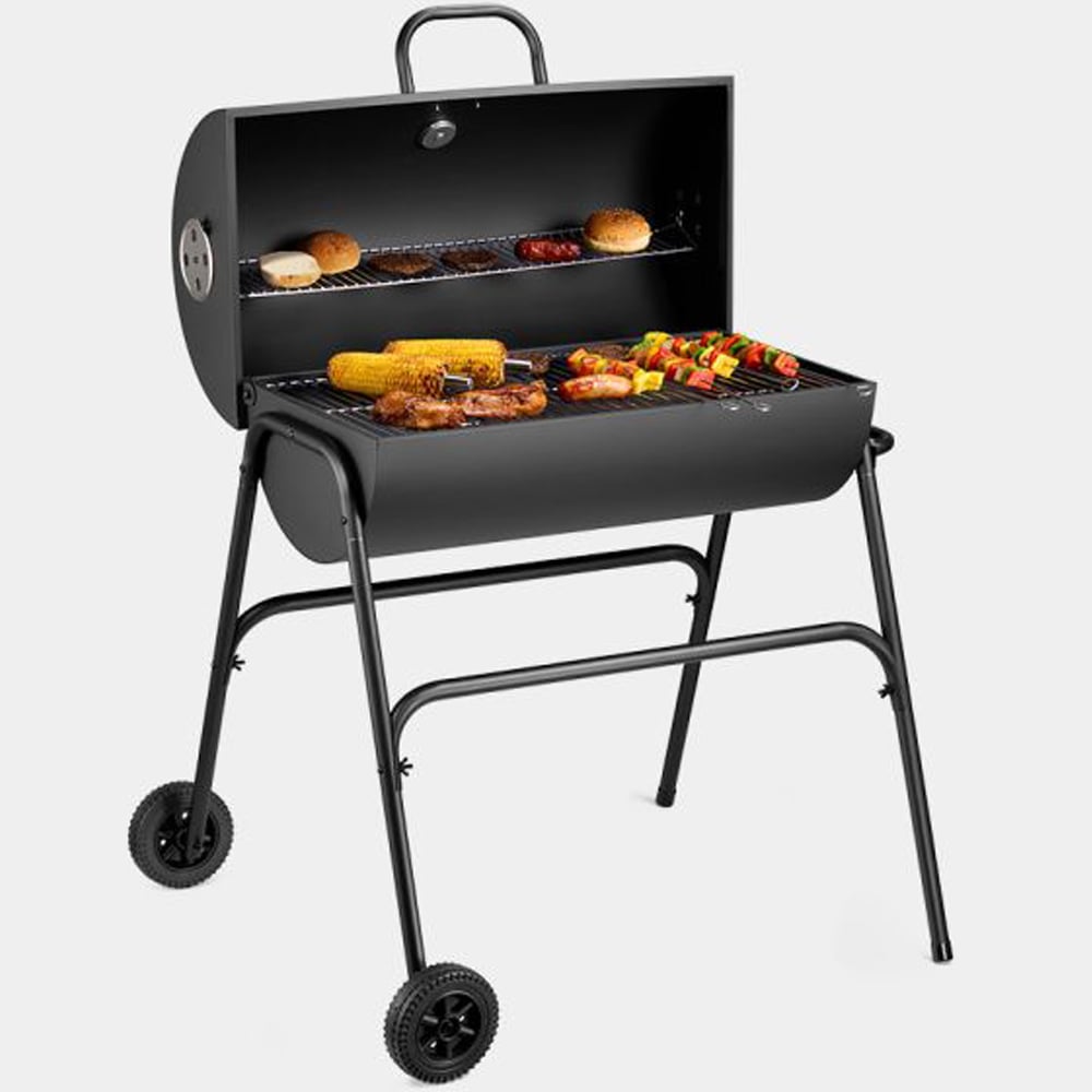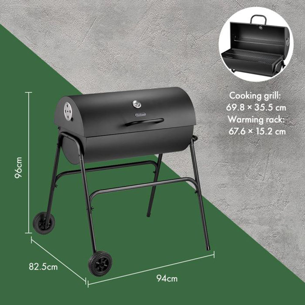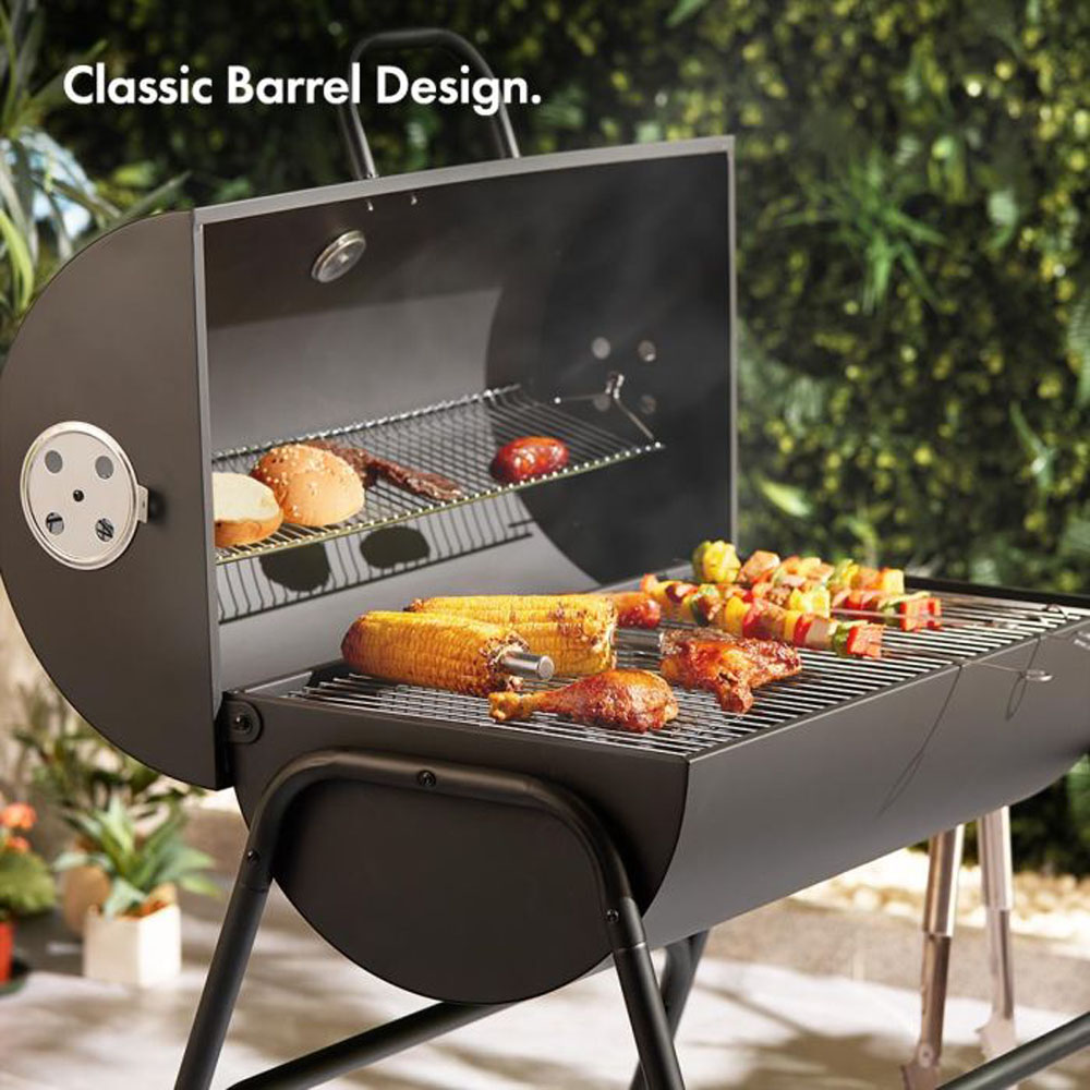Drum Barbecue with Grill & Warming Rack | 2-in-1 Charcoal Grill & Wood Smoker Got a taste for authentic woodfired cooking? Transform the barrel barbecue from a classic charcoal grill to an American-inspired wood smoker by closing off the ventilation and stacking woodchips under the grill. Whether you’re a BBQ novice or self-proclaimed grill master, catering for a crowd has never been easier. Monitor the temperature with the on-lid temperature gauge, maintain the perfect cooking conditions via the lift-up grill hatch, and keep everything warm using the warming rack.