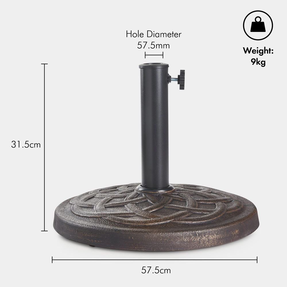 Prepare to bask in the summer sun without worrying about the wind with the VonHaus Rustic Brushed Bronze Effect Polyresin Parasol Base 9kg. This sturdy base will ensure your beautiful parasol stays secure and stable during those windy days. Designed to accommodate both wooden and steel parasols, this base is a perfect fit for poles with a diameter of up to 57.5mm. Its elegant decorative motif adds a touch of sophistication, perfectly complementing the aesthetic of your parasol. This base strikes the ideal balance, keeping your parasol firmly grounded while remaining effortlessly portable.