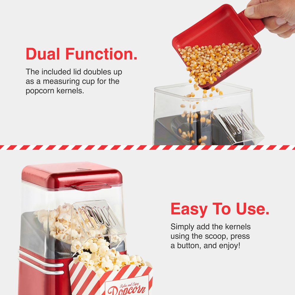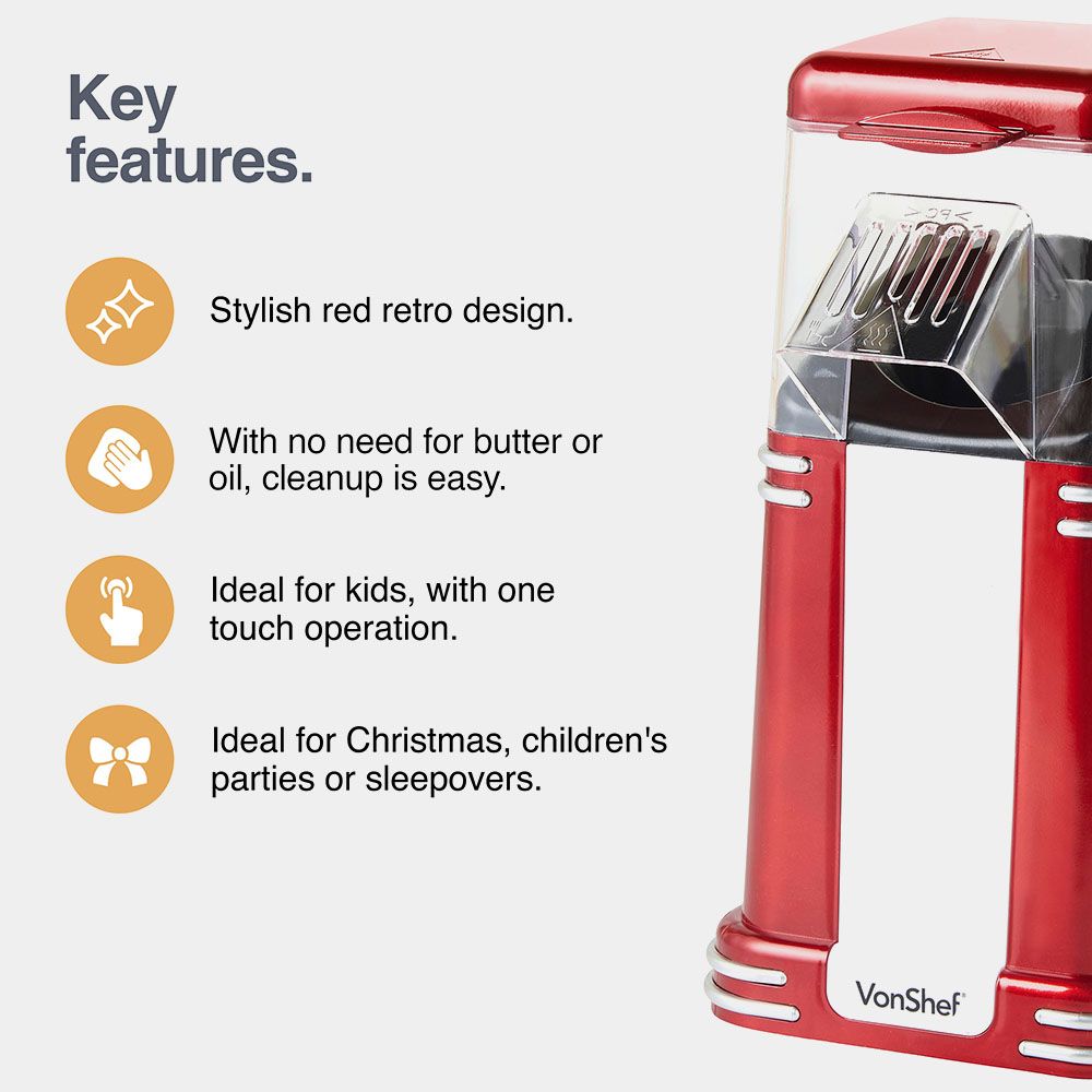 Have a fun movie night with the VonHaus VonShef Retro Popcorn Maker. This vintage-style popcorn maker is ideal for movie nights, house parties or when you crave a sweet treat. It offers a healthier and more cost-effective alternative to store-bought popcorn. It features a retro red and white colour and eliminates the need for oil and butter with its hot air circulation function. The included lid performs a dual function as a measuring cup for the popcorn kernels.