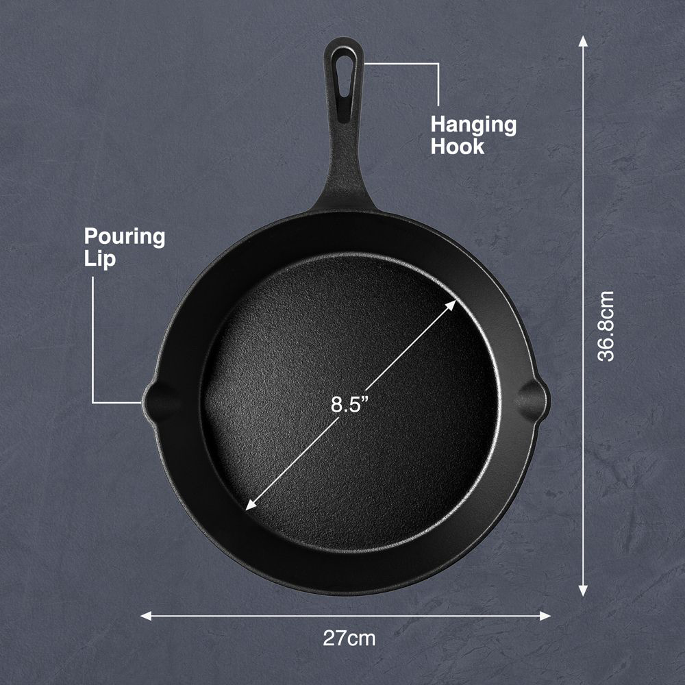 Elevate your cooking experience with the VonHaus VonShef Seasoned Cast Iron Skillet Pan. This classic round skillet or frying pan is suitable for all hob surfaces, including, gas, electric, ceramic/halogen, induction and oven. It can also be used for barbeque and on the campfire. This frying pan is made from pre-seasoned cast iron, making it non-stick. The seasoning process involves baking vegetable oil onto the surface at a high temperature, creating a naturally non-stick surface, without the need for any chemical coating. You can keep the pan’s non-stick properties by rubbing in a little fresh oil after washing in soap and water.