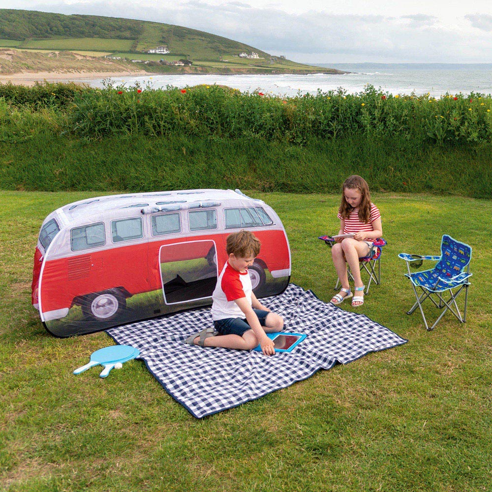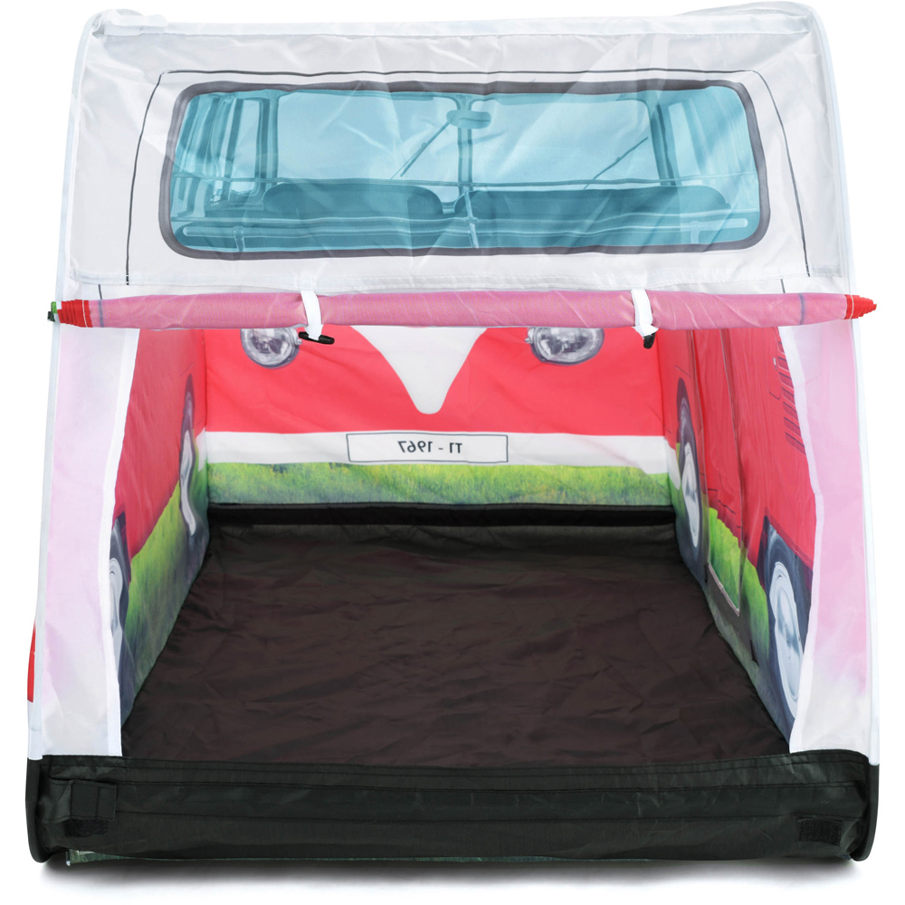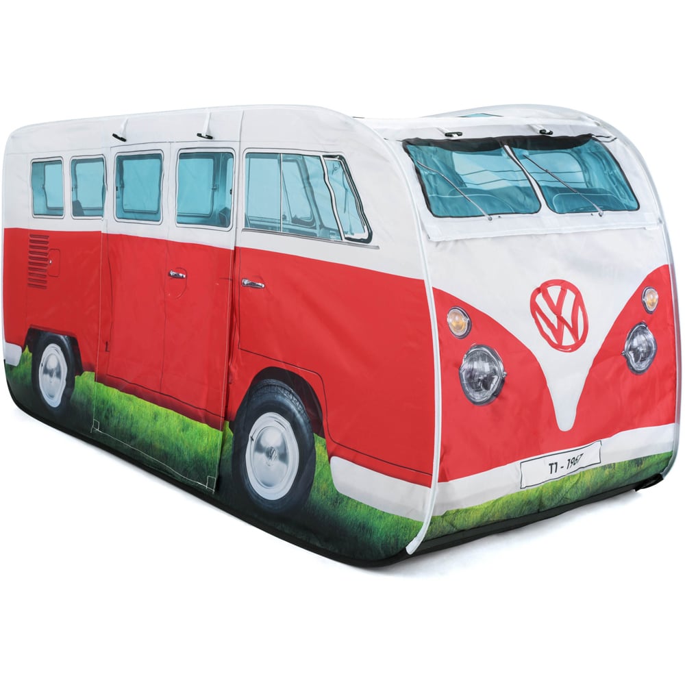 Keep your children busy for hours with this VW Titan Red Kids Pop Up Van Tent, a fantastic mini version of the iconic 1965 classic split-screen camper van. It's designed to accommodate up to three children and is suitable for both indoor and outdoor use. The tent features side and rear doors, as well as an opening safari window, just like the real camper van. In addition, it offers UPF50+ protection, making it an ideal choice for parents who want to shield their children from the sun during beach days, park outings, or even festivals. Setting up the tent is a breeze thanks to its pop-up construction, and it can be taken down just as easily. Plus, the included carry bag makes transporting and storing this unique kid’s tent a simple task. Includes fibreglass poles, clear instructions and a carry bag.