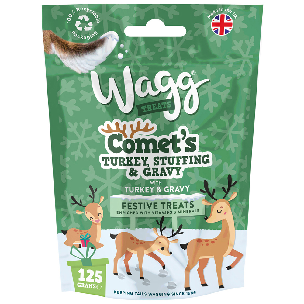 Delight your furry friend with festive snacks with these Wagg Treats Comet's Turkey Stuffing and Gravy Dog Treats 125g. Baked in the oven for a delicious natural flavour, these enjoyable bites are enriched with additional vitamins and minerals and contain no added sugar. A perfect way to include your pet in the holiday celebrations, they make an excellent present for your dog and serve as a fantastic training reward.