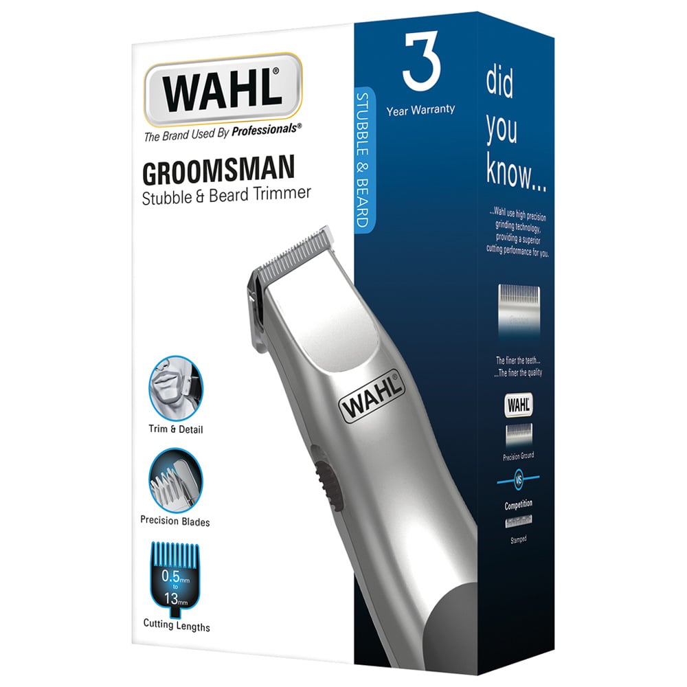 Complete your grooming needs with this Wahl Groomsman Battery Operated Beard Trimmer. This device gives you the freedom of cordless trimming, so you can easily trim and detail. Battery-operated, this trimmer allows full flexibility when styling and you can use it anywhere. With high-carbon precision, the ground blades stay sharper for longer and are perfect for touching up your neckline, beard, and more to get that fresh, well-groomed look at home. The trimmer includes six-position combs and three washable guide combs.