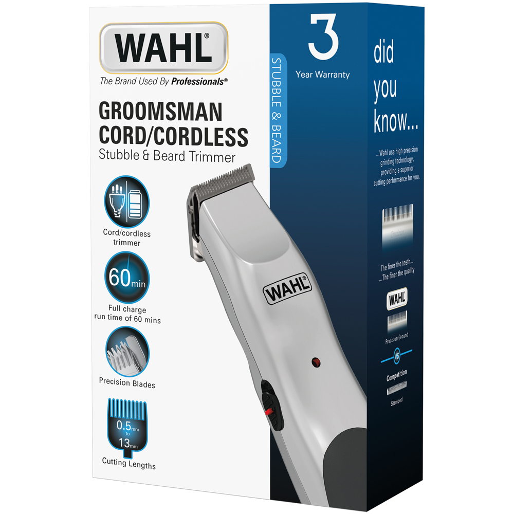 Make grooming easier than ever with the Wahl Groomsman Trimmer Style Kit Silver. With precision ground blades, this trimmer ensures effortless grooming. The ergonomically shaped trimmer fits comfortably in your hand, allowing you to shave with ease. It can be used corded or cordless for convenience and ease of use. The trimmer comes with one adjustable guide comb and three close-trim attachment combs for versatility.