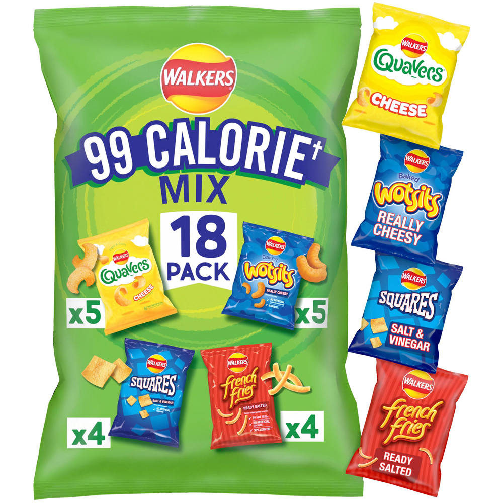 - 18 Packs Of Walkers 99 Calorie Mix Snacks - Multipack Contains 5 X 16G Packets Of Walkers Quavers Cheese Snacks, 5 X 16.5G Packets Of Walkers Wotsits Cheese Flavour Corn Puffs, 4 X 22G Packets Of Walkers Squares Salt & Vinegar Potato Snacks And 4 X 18G Packets Of Walkers French Fries Ready Salted Flavour Crispy Potato Snack - This Multi-Pack Is Ideal For Lunch Or Sharing With Family And Friends - Suitable For Vegetarians And Contains No Artificial Colours. No Artificial Colours. Suitable For Vegetarians. Walkers.
