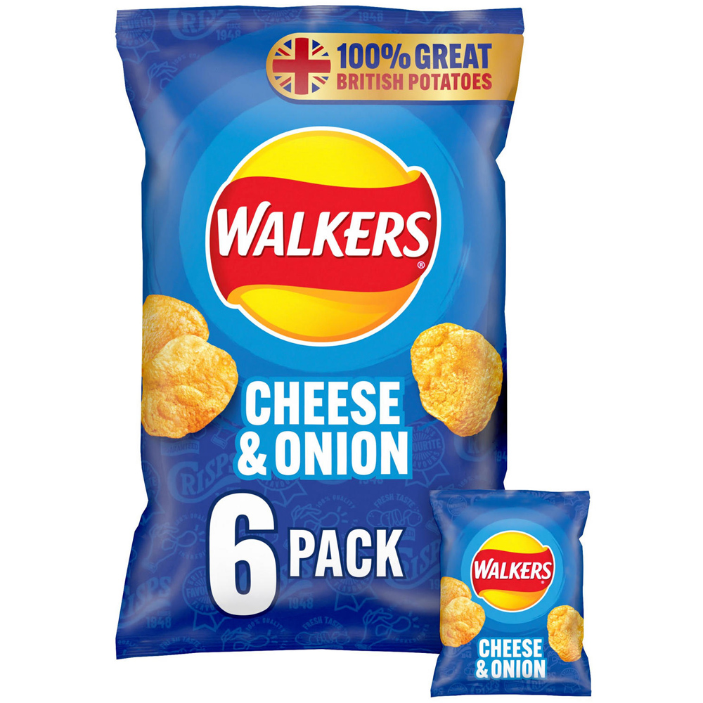 - Multipack Of Walkers Cheese And Onion Crisps - Made With 100% Great British Potatoes - Fresh Taste Guaranteed - Perfect Crisps For Lunch And Snacking - Multipack Contains 6 Bags Of Crisps - Suitable For Vegetarians - No Added Msg, Artificial Colours Or Preservatives. 100% Great British Potatoes. Some See Potatoes, We See Potential. Britain's Favourite Flavours. We Use Sustainably Sourced British Potatoes. 100% Quality Ingredients. Fresh Taste Guaranteed. No Added Msg, Artificial Colours Or Preservatives. Suitable For Vegetarians. Walkers.