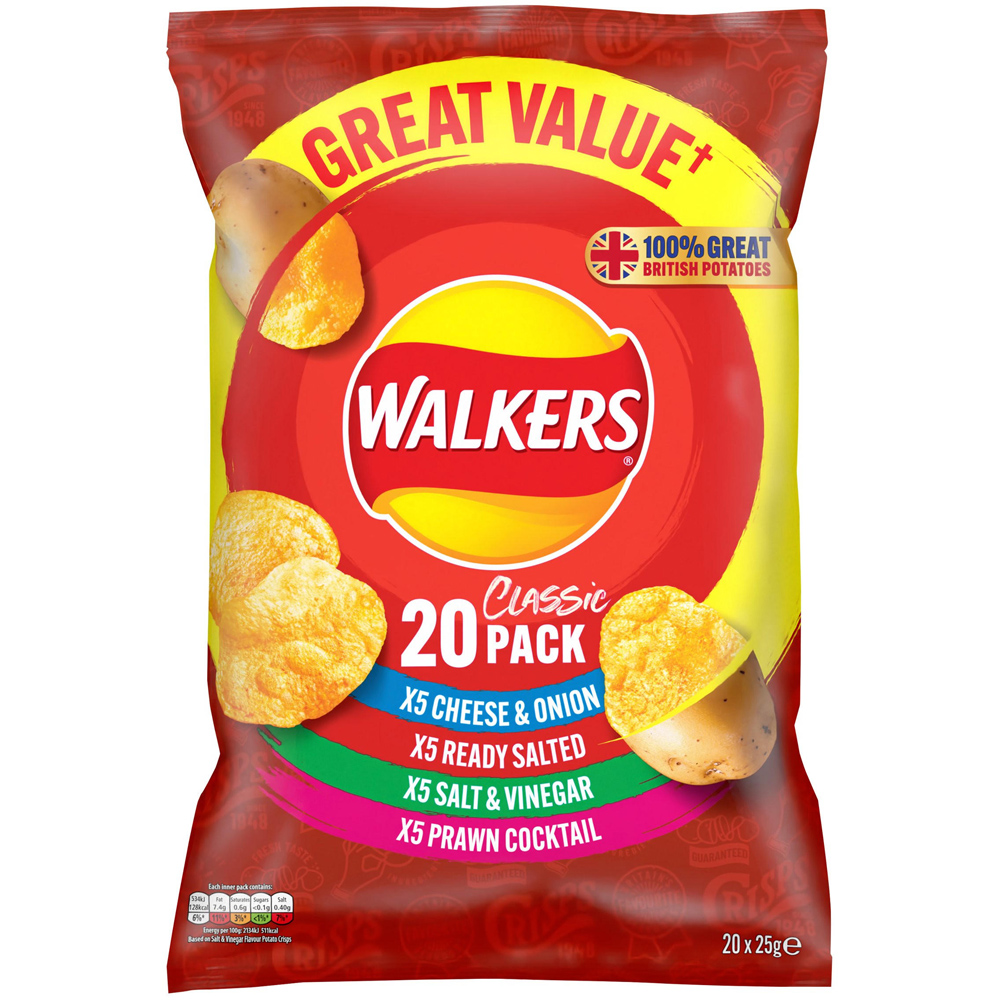 - Multipack Of Walkers Classic Variety Crisps - Multipack Contains 5 X Ready Salted, 5 X Cheese & Onion, 5 X Salt & Vinegar And 5 X Prawn Cocktail - Made With 100% Great British Potatoes - Fresh Taste Guaranteed - Perfect Crisps For Lunch And Snacking - Suitable For Vegetarians - No Added Msg Or Artificial Colours. 100% Great British Potatoes. Britain's Favourite Flavours. We Use Sustainably Sourced British Potatoes. 100% Quality Ingredients. Fresh Taste Guaranteed. No Added Msg Or Artificial Colours. Suitable For Vegetarians. Walkers.