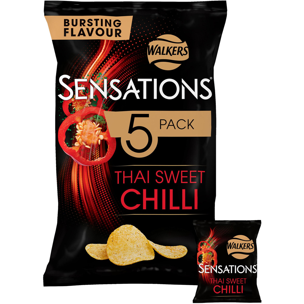 - Discover The Extraordinary Flavour Of Sensations Crisps, Crafted With The Best Potatoes And A Thick Cut Technique For A Satisfying Crunch - Sensations Thai Sweet Chilli Crisps Combine A Subtly Sweet And Spicy Flavour With Fragrant Herbs And A Delicate Kick To Finish - Multipack Includes 5 Packs Of Sensations Crisps - Suitable For Vegetarians - Contains No Artificial Colours, Preservatives Or Msg. Specially Selected Potato Varieties. No Artificial Colours Or Preservatives. No Msg. Suitable For Vegetarians. Walkers.