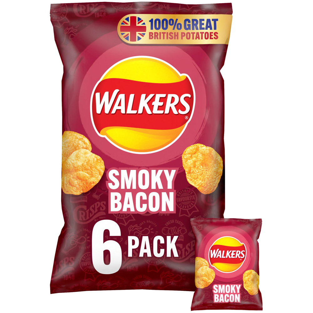 Multipack Of Walkers Smoky Bacon Crisps - Made With 100% Great British Potatoes - Fresh Taste Guaranteed - Multipack Contains 6 Bags Of Crisps - Suitable For Vegetarians - No Added Msg Or Artificial Colours. 100% Great British Potatoes. Some See Potatoes, We See Potential. Britain's Favourite Flavours. We Use Sustainably Sourced British Potatoes. 100% Quality Ingredients. Fresh Taste Guaranteed. No Added Msg Or Artificial Colours. Suitable For Vegetarians. Walkers..