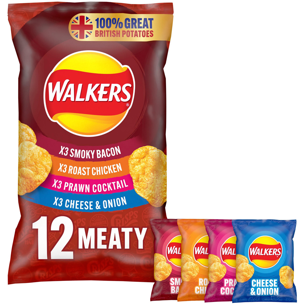 Multipack Of Walkers Meaty Variety Crisps - Multipack Contains 3 X Smoky Bacon, 3 X Roast Chicken, 3 X Prawn Cocktail And 3 X Cheese & Onion - Made With 100% Great British Potatoes - Fresh Taste Guaranteed - Suitable For Vegetarians - No Added Msg, Artificial Colours Or Preservatives. Some See Potatoes, We See Potential. 100% Great British Potatoes. Britain's Favourite Flavours. We Use Sustainably Sourced British Potatoes. 100% Quality Ingredients. Fresh Taste Guaranteed. No Added Msg Or Artificial Colours. Suitable For Vegetarians. Walkers..