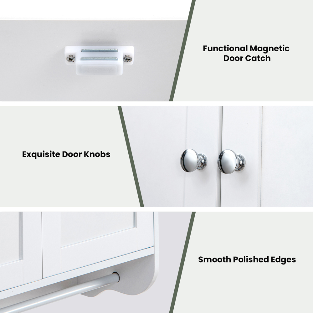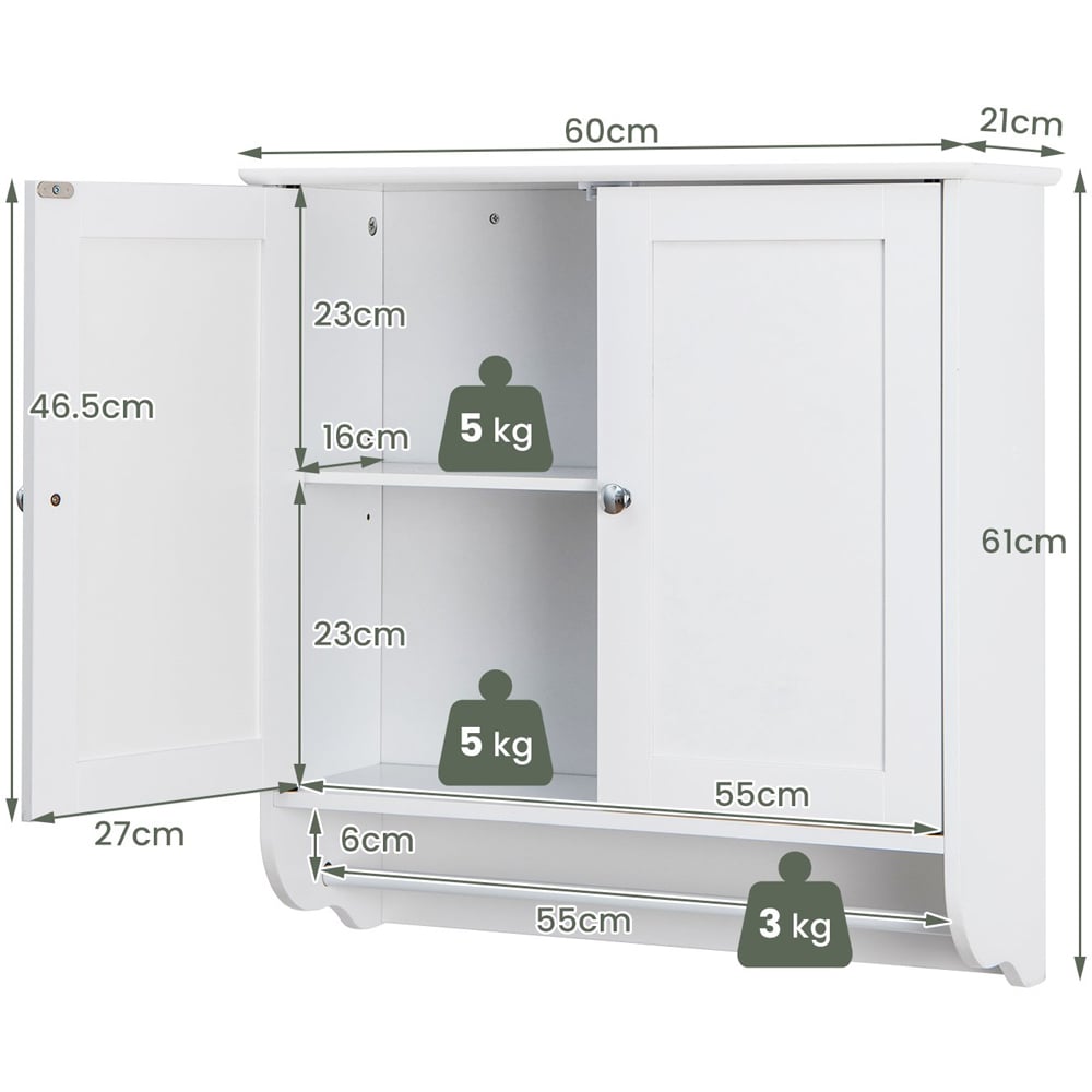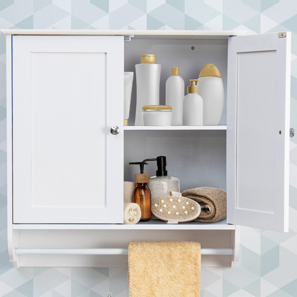 Keep your space clutter-free and stylish with the Costway 2 Door White Wall Mounted Bathroom Cabinet with Hanging Bar. Designed to optimize your room's layout, this cabinet offers a clever solution to store your bathroom essentials or kitchen supplies without sacrificing floor space. It features a two-tier design with an adjustable shelf that can be set in three different positions, catering to items of varying sizes. The integrated towel bar keeps your towels dry and within reach. Crafted from durable P2 MDF, this cabinet promises longevity and is easy to assemble and maintain, ensuring it remains a practical yet chic addition to any room, be it your bathroom, kitchen, or laundry area.