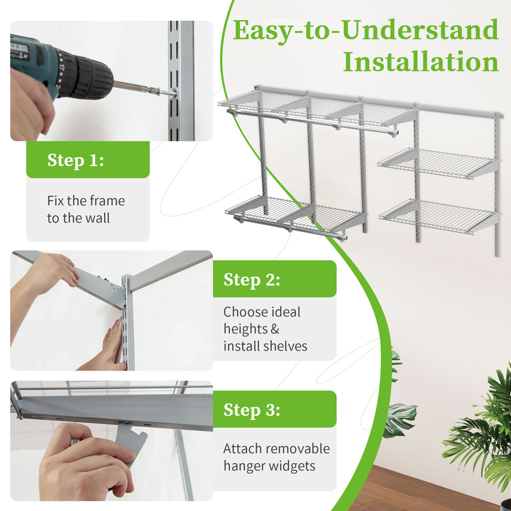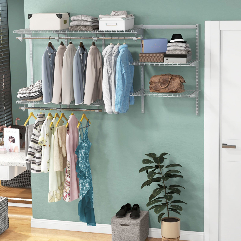 Transform your living space with the Costway Silver Adjustable Wall Mounted Closet Shelf, a versatile solution that easily adapts to your storage needs. Whether you're dealing with a compact 3ft closet or a more expansive 6ft space, this system adjusts seamlessly, providing up to 135 inches of shelving and 81 inches of hanging space. Its robust design features premium steel construction, ensuring durability and stability. The adjustable shelves and hanging rods allow for a tailored storage experience, perfect for everything from seasonal clothing to kitchen essentials. Plus, the ease of assembly and straightforward cleaning process make this organiser a practical choice for any home.