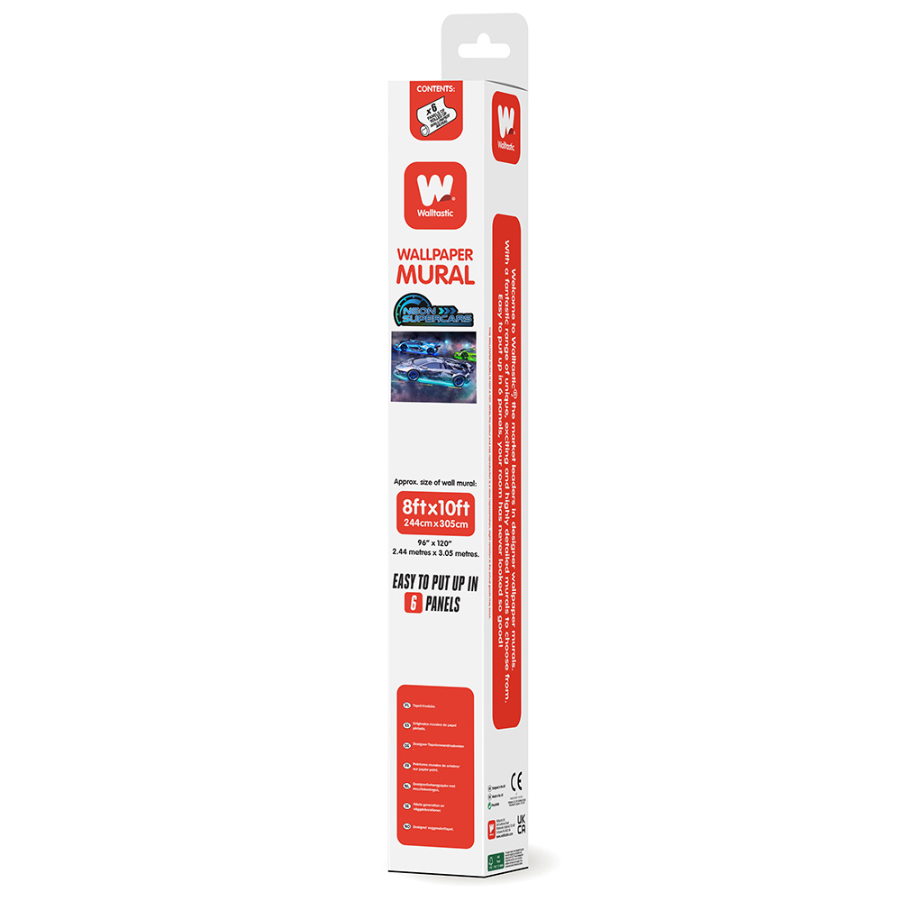 Transform your room with this Neon Supercars Wall Mural from Walltastic. This mural comes in panels in a gift box rolled similar to wallpaper, which makes it easily applicable and flexible according to how much space needs covering. Suitable for a bedroom, nursery and playroom, the mural features a smooth finish that will add a wow factor to a children's room. Plus, it is easy to install- simply follow the step-by-step instruction guide! The wall covering covers a wall area up to 8 x 10ft (243.84cm x 304.80cm). Pattern match: Straight with an overlap. Method: Paste the Paper. Directions to use: Select the first panel. Lay the panel face down on a flat surface. Apply the wallpaper paste evenly to the back of the panel, and allow the paste to soak for 1 - 2 minutes, do not lay the pasted sheets on top of each other, apply the panel onto the wall using a soft cloth. Repeat the steps for the remaining panels, following the printed guidelines on each panel overlap all joining edges by approximately 6mm, this prevents the seams from showing after they dry. Trim the excess edges carefully after the paper has dried.