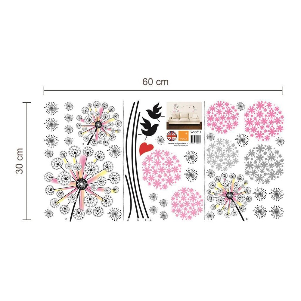 Make your interior space more exquisite with the Walplus Pink Dandelions Wall Stickers. To apply, just peel and stick onto any clean and flat surface like the walls of your interior spaces and you are good to go. These self-adhesive wall stickers are crafted using quality PVC material, they are easy to install and remove without leaving a trace. These stickers can be easily trimmed or cut to fit according to your requirements. Application notes: Please only attach to the painted surface at least three weeks after painting and clean the surface before application. Stickers applied on laminated or wallpapered surfaces cannot be removed. Do not apply in places that have direct contact with fire. Please note that due to different devices and screen settings, the colour of the webpage picture you see may have a certain colour difference from the actual product. This package includes one sheet of 30 x 60cm with 44 pieces of stickers. Finishing size: 110 x 60cm.