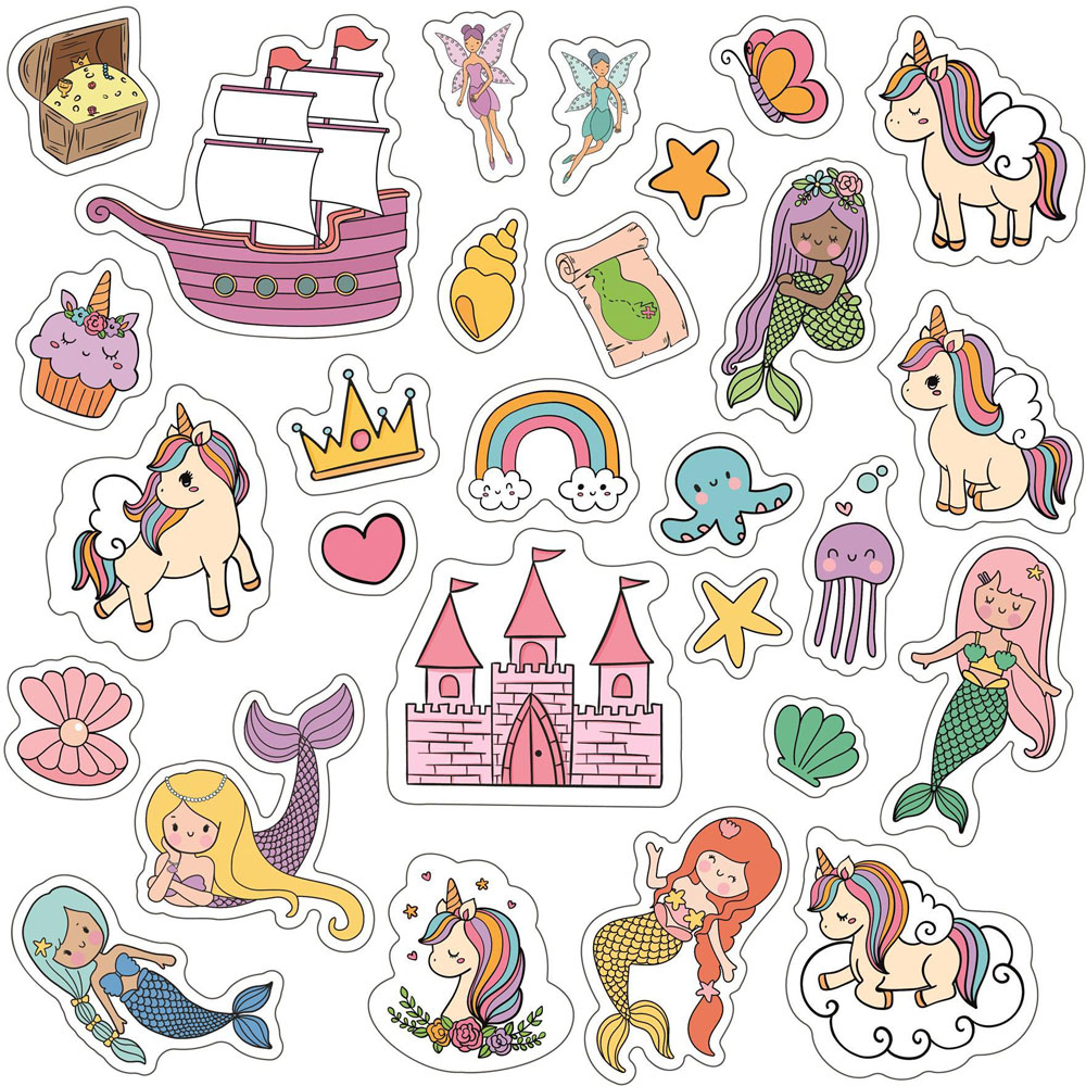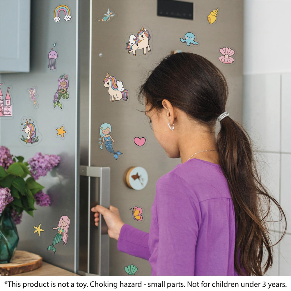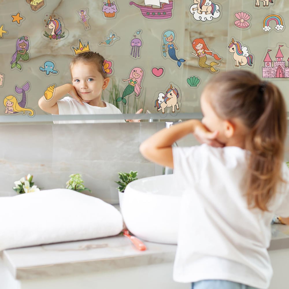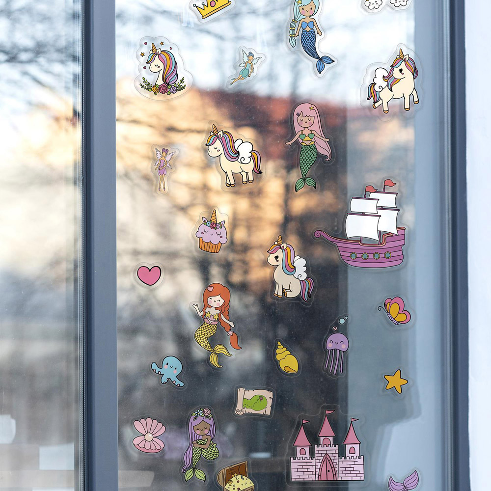 Step into a realm of fantasy with the Walplus Magical Unicorns and Mermaids Double Sided Reusable Gel Window Sticker 28 Piece. These enchanting designs are produced with a great quality print that captures the imagination and adds a touch of whimsical charm to your home decor. Perfect for children’s rooms, play areas, or as part of a themed party, the gel clings are suited for application on a variety of surfaces, including windows, mirrors, and more. You can easily reposition them or remove them without any mess. To ensure a successful application, be sure to start with a clean and smooth surface. For added convenience, a light spray of water can be applied to the window or surface; this simple step can help you achieve a better bond with the clings. When you’re ready to switch things up or pack them away, simply remove the clings gently, and they will come off cleanly without damaging the underlying surface. Please note that printed colours may still vary slightly from what you see on your screen. Each package contains two sheets, measuring 28 x 18cm, encompassing 28 clings in total, allowing you to craft a magical scene filled with unicorns and mermaids at your leisure.