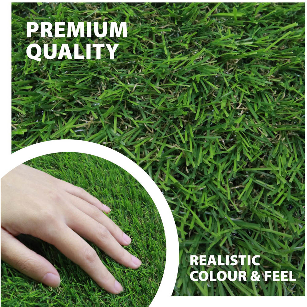 The WALPLUS Summer Turf is a premium artificial grass that has fantastic UV protection. They don't fade in sunlight and stay lush green all year round. Perfect for your garden, patio, terrace or other uses. No weeding, no cutting and no watering required all year round! This grass is lead and cadmium-free and very child and pet-friendly. Easy to fit, this grass is DIY-friendly. All have UV-resistant fibres with a latex backing that allows drainage. This artificial grass requires no water and is environmentally friendly. The package contains one roll of artificial grass. The coverage area per roll is 4m wide by 1m long and 30mm pile height, with a total coverage of 4 m2. The weight is 2.6kg per roll. This artificial grass has a year warranty (under manufacture terms).