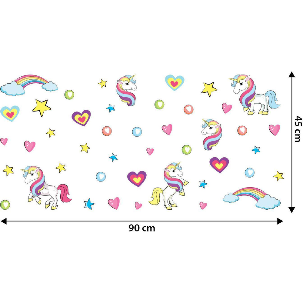 Make fairy tales come to life with the Walplus Unicorn Kids Bedroom Wall Stickers. With these stickers, you can create a fun and engaging environment that your little ones will love. Made of high-quality PVC material, the stickers are easy to install and remove, so you can switch up the design whenever you like without leaving any residue. Plus, the sticker can be easily trimmed or cut to fit your needs. Let your child's imagination run wild and bring their dreams to life with these charming wall stickers. To apply, simply peel and stick onto any clean, flat surface such as a wall, furniture, or window screen, and you're good to go. Application Notes: Please wait at least three weeks after painting before attaching it to the painted surface and clean the surface before applying. Stickers applied to laminated or wallpapered surfaces cannot be removed. Avoid applying the sticker in places with direct contact with fire. Please note that the colour of the actual product may differ slightly from your monitor's colour. Package content: 1 sheet of 30 x 60cm with 44 pieces of stickers. Finishing size: 90 x 45cm or 35.4 x 17.7 inches.