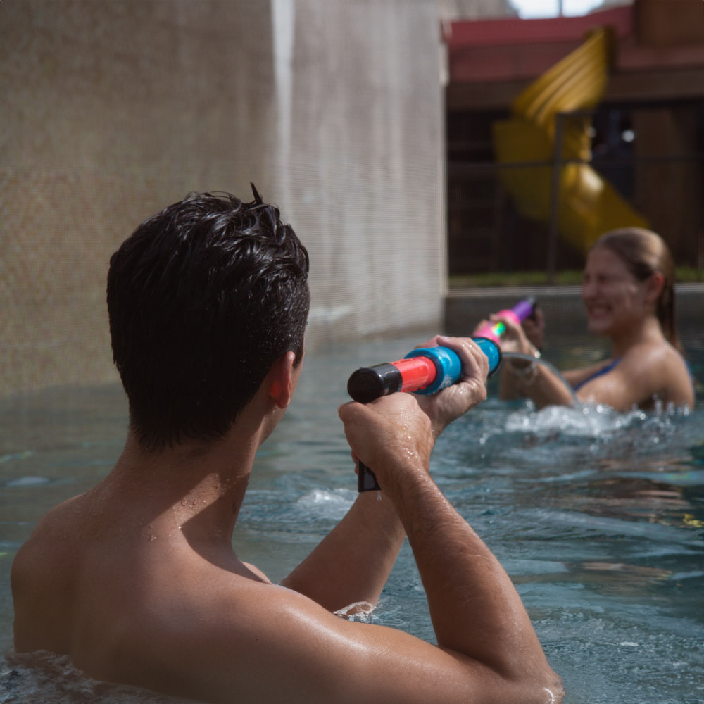Stream Saber water launcher is the ideal water accessory for soaking wet fun in the backyard, pool, beach and boat. Perfect for day and nighttime fun with it's colour changing lighted barrel. The barrel has a removable nozzle for easy cleanout of debris and maintenance. Adjustable Length for Precision: With a 17-inch overall length and a 14-inch extendable barrel (capable of reaching 26 inches), you can achieve near-perfect aim every time, enhancing your pool games experience.