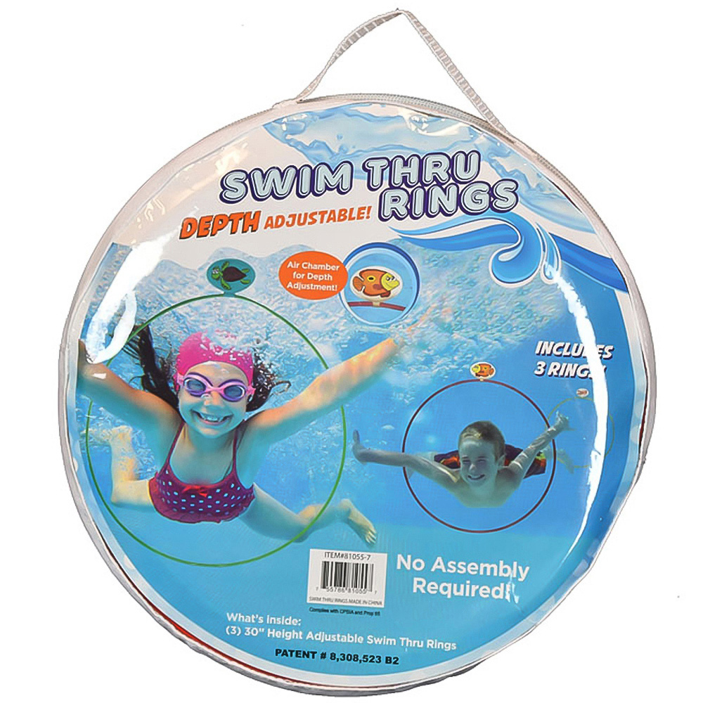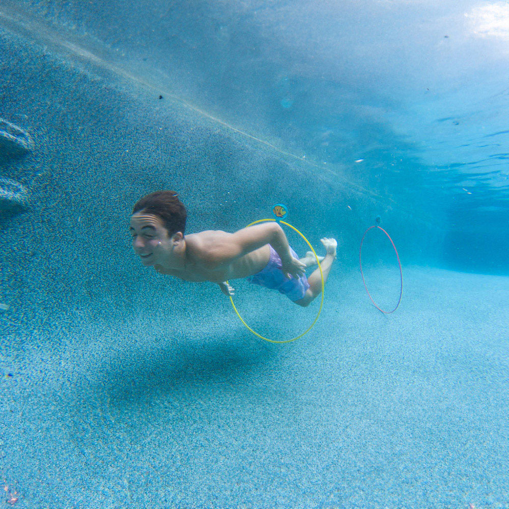 Patented rings easily unfold and inflates in seconds. Includes 3 rings each 79cm in diameter. Collapsable for easy storage. Each hoop has adjustable air chambers allowing you to shoose your underwater depth for each ring.