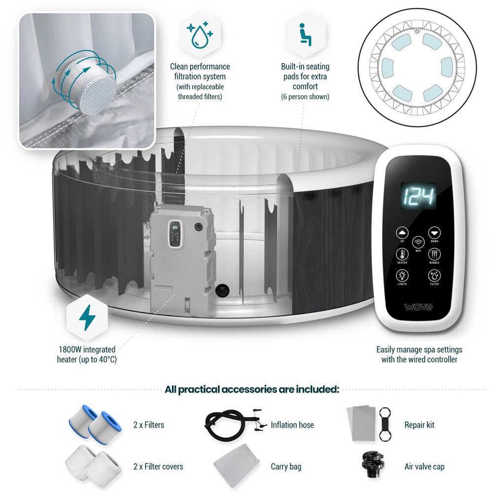 Experience unparalleled relaxation with the Wave Atlantic 6 Person Grey Rattan Inflatable Hot Tub with Integrated Heater. Designed for comfort and efficiency, this spa features an integrated heater that rapidly warms the water to your desired temperature, ensuring a soothing experience year-round. The Aquajet Massage System delivers a powerful and invigorating massage, melting away stress and tension. With its anti-freeze protection, the Wave Atlantic ensures safe operation even during colder months, maintaining optimal performance regardless of the season. The sleek design complements any outdoor setting, making it a stylish addition to your garden or patio. Setting up the hot tub is a breeze, taking just 15 minutes without the need for any tools. Elevate your outdoor relaxation with the Wave Atlantic Inflatable Hot Tub, combining innovative features with superior comfort for the ultimate spa experience.