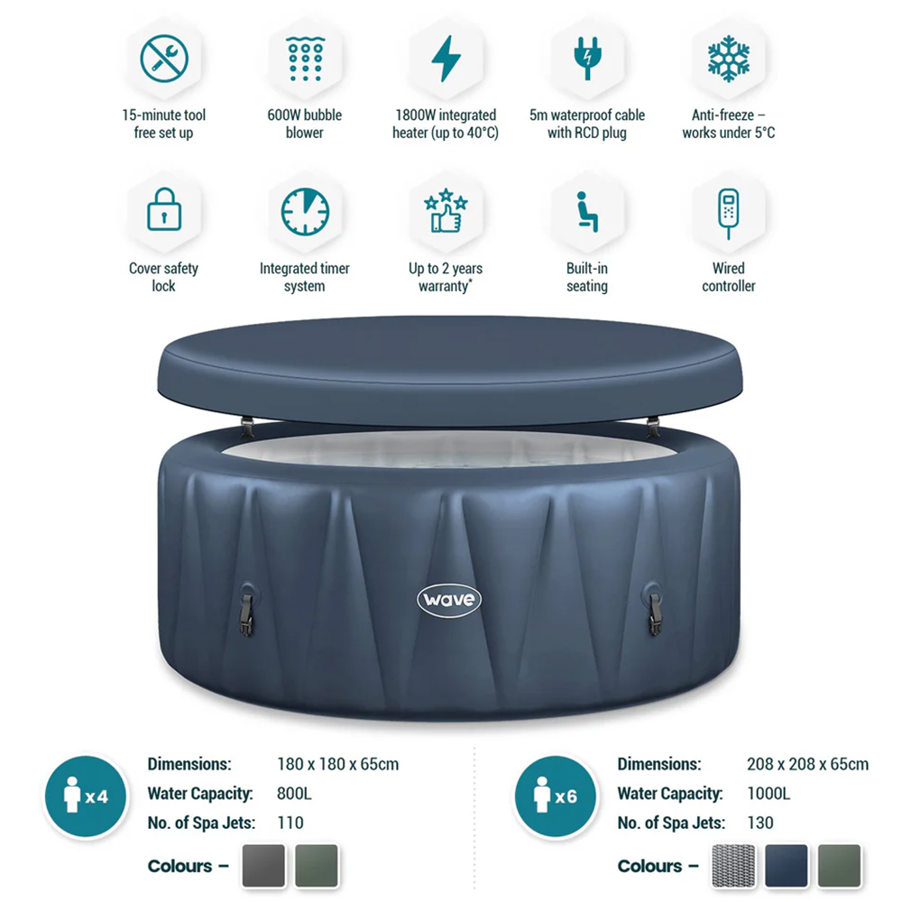 Experience unparalleled relaxation with the Wave Atlantic 6 Person Navy Inflatable Hot Tub with Integrated Heater. Designed for comfort and efficiency, this spa features an integrated heater that rapidly warms the water to your desired temperature, ensuring a soothing experience year-round. The Aquajet Massage System delivers a powerful and invigorating massage, melting away stress and tension. With its anti-freeze protection, the Wave Atlantic ensures safe operation even during colder months, maintaining optimal performance regardless of the season. The sleek design complements any outdoor setting, making it a stylish addition to your garden or patio. Setting up the hot tub is a breeze, taking just 15 minutes without the need for any tools. Elevate your outdoor relaxation with the Wave Atlantic Inflatable Hot Tub, combining innovative features with superior comfort for the ultimate spa experience.