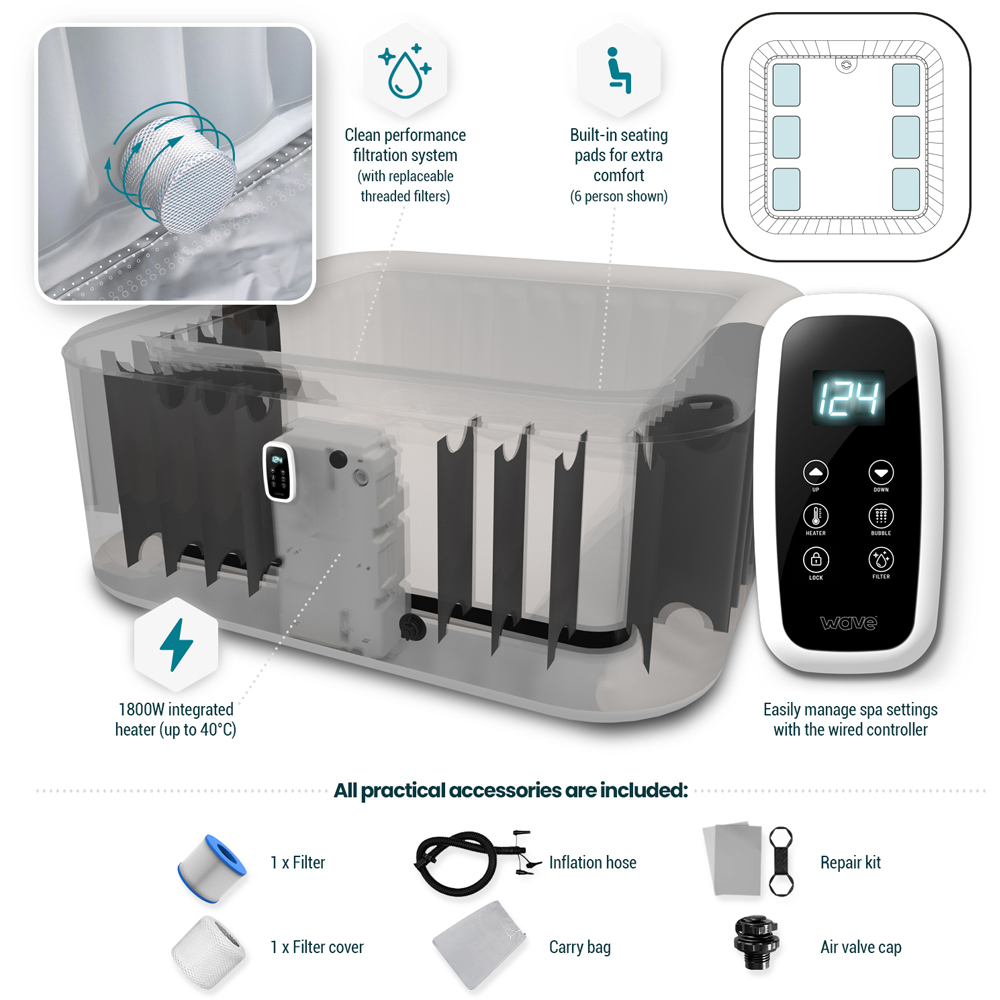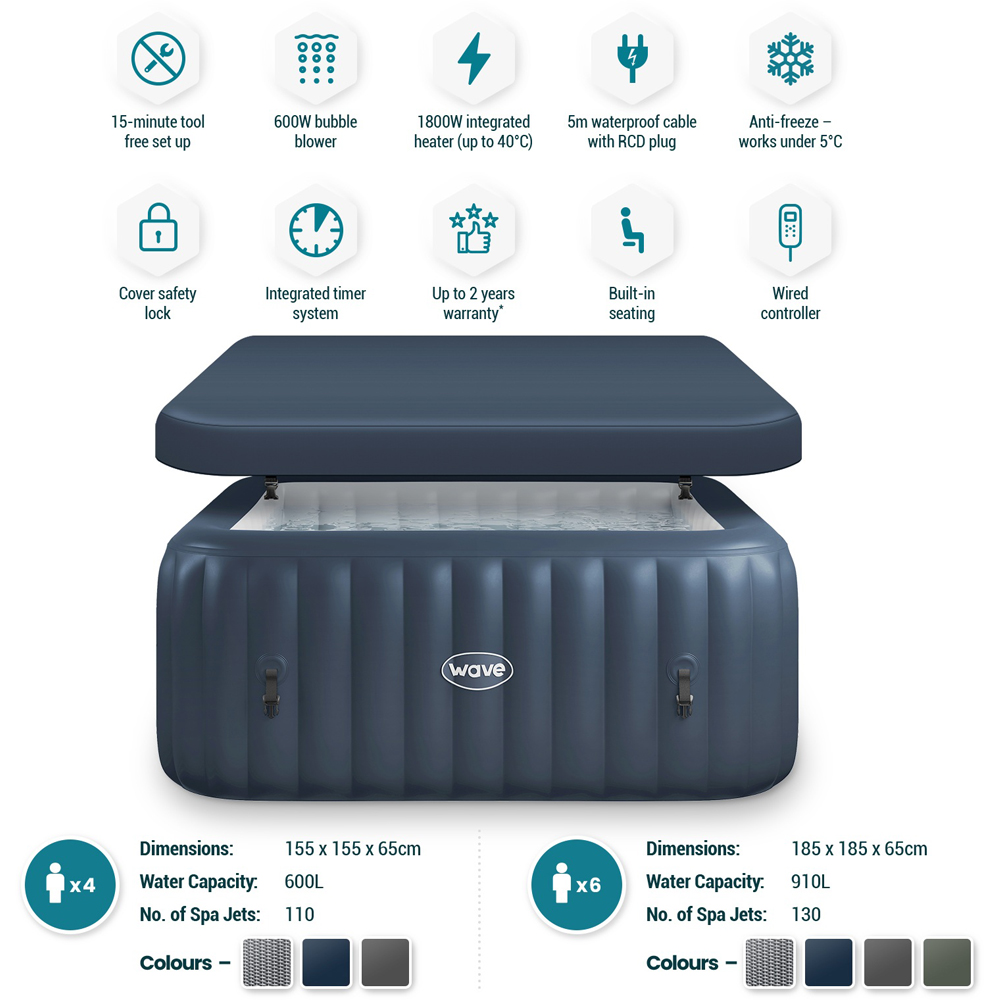 Experience unparalleled relaxation with the Wave Pacific 4 Person Navy Inflatable Hot Tub with Integrated Heater. Designed for comfort and efficiency, this spa features an integrated heater that rapidly warms the water to your desired temperature, ensuring a soothing experience year-round. The Aquajet Massage System delivers a powerful and invigorating massage, melting away stress and tension. With its anti-freeze protection, the Wave Atlantic ensures safe operation even during colder months, maintaining optimal performance regardless of the season. The sleek design complements any outdoor setting, making it a stylish addition to your garden or patio. Setting up the hot tub is a breeze, taking just 15 minutes without the need for any tools. Elevate your outdoor relaxation with the Wave Atlantic Inflatable Hot Tub, combining innovative features with superior comfort for the ultimate spa experience.