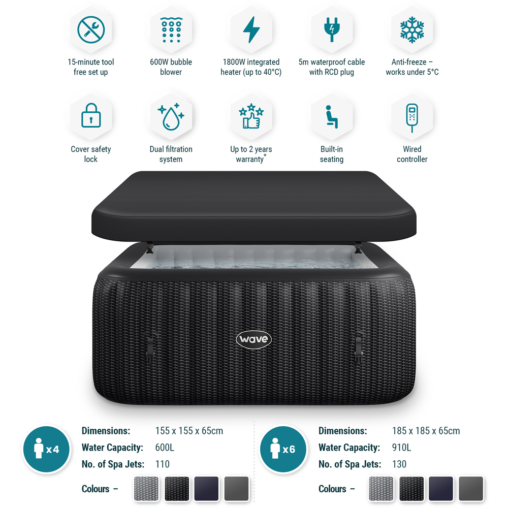 Step into a world of tranquillity with the Wave Pacific 6 Person Slate Rattan Inflatable Hot Tub with Integrated Heater, designed for ultimate comfort and efficiency. This luxurious spa features an integrated heater that quickly warms the water to your ideal temperature, creating a relaxing ambience throughout the year. The Aquajet Massage System delivers a dynamic and invigorating massage, relieving stress and tension with every soak. Thanks to its anti-freeze protection, the tub ensures safe operation in colder weather, maintaining exceptional performance regardless of the season. Its chic design seamlessly integrates into any outdoor setting, enhancing your garden or patio with style. Setup is a breeze, needing just 15 minutes and no tools at all. Elevate your outdoor relaxation experience with the hot tub, combining innovative technology and superior comfort for a truly exceptional spa experience.
