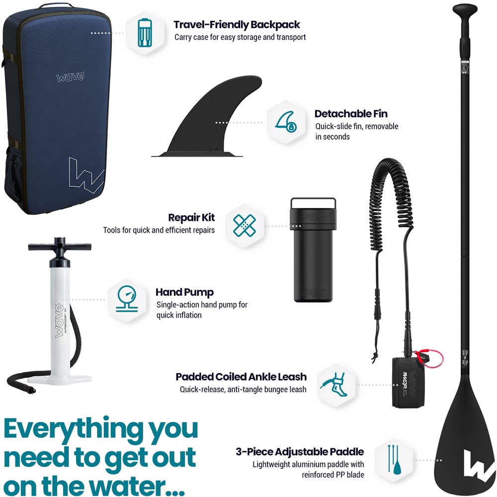 Discover the joys of stand-up paddleboarding with the Wave White Cruiser SUP Board 10ft 9 inch. Designed for beginners, this board is longer and wider, offering enhanced stability to help you get used to the sport. Ideal for picnics near lakes and rivers, this cruiser is a complete package that includes a high-pressure pump, an adjustable paddle, and a safety leash.