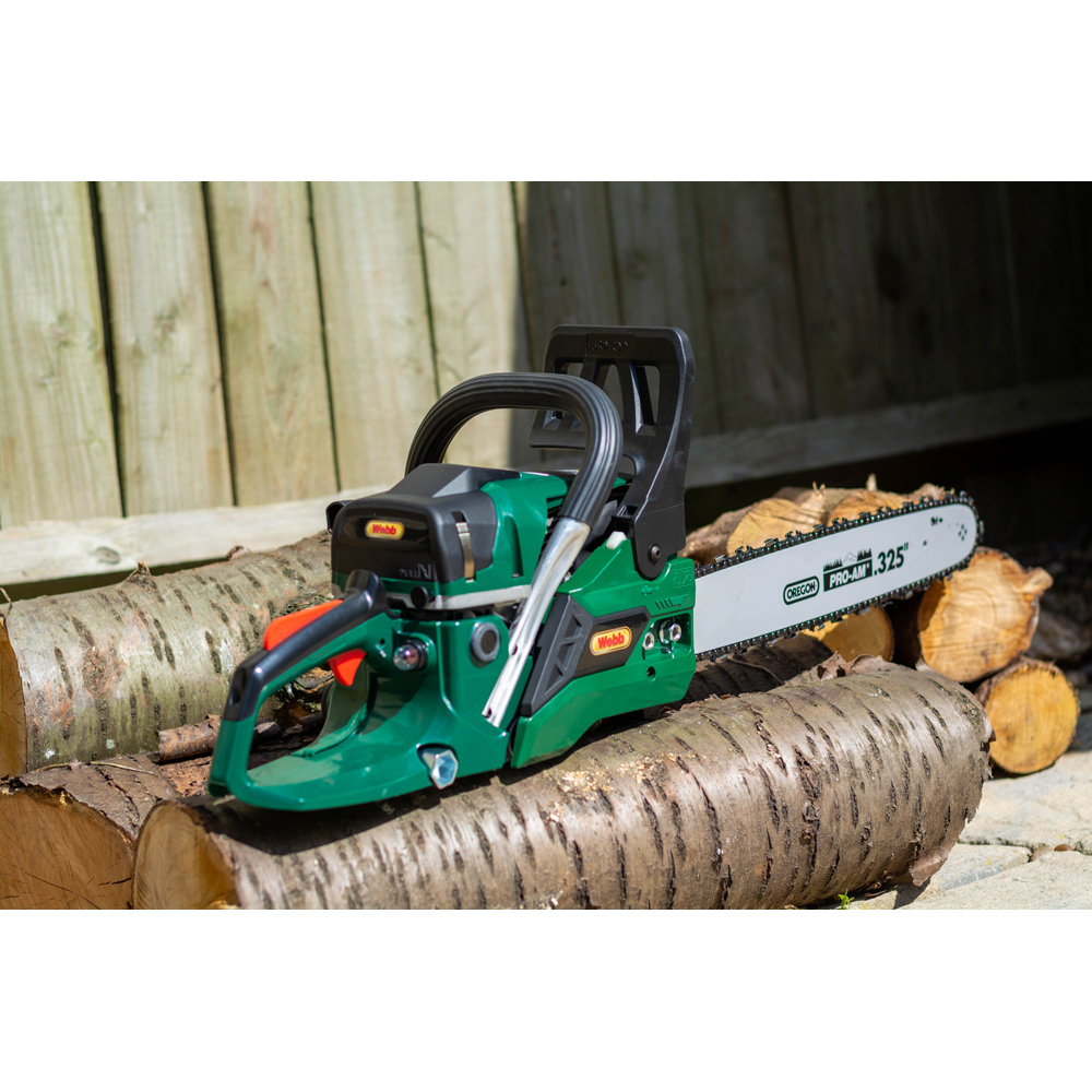 Webb WEPCS18 46cm (18") 50cc Petrol Chainsaw, The Webb WEPCS18 Petrol Chainsaw is a powerful and versatile tool designed for large gardens. With its 18” cutting bar and lightweight design, it effortlessly tackles firewood chopping, pruning, and DIY tasks. Featuring a 50cc 2-stroke engine, ergonomic handles, and intuitive controls, it offers performance and ease of use. Backed by a 3-year guarantee.
