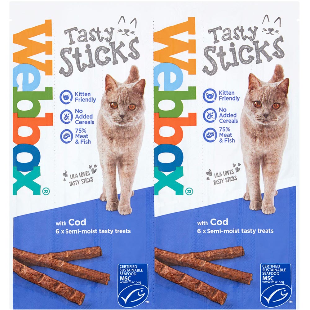 Your cat deserves the best, and Webbox Tasty Sticks Cod Semi Moist Kitten Treat 30g 6 Pack are the ultimate delicious treat. These chewable snacks, packed with 75% meat and fish, are gently cooked for maximum flavour. Individually wrapped for freshness and free from egg, dairy, soya, grain, and wheat, these sticks are gentle on your cat's tummy and a guaranteed hit with your beloved feline. Feeding guidelines: Weight of cat: 2kg, no. Sticks per day: 1/2-1; weight of cat: 4kg, no. sticks per day: 1; weight of cat: 6kg, no. sticks per day: 2. The quantities shown above should be used as a guideline only. Please adjust the amount given to keep your cat or kitten in a lean, active condition. Fresh drinking water should be provided at all times. Always supervise your cat or kitten when feeding treats. Composition: Meat and animal derivatives (90%, of which 70% meat), fish and fish derivatives (5% cod*), minerals, *from an MSC certified sustainable fishery. Technological additives: Preservatives; antioxidants. Unopened, store in cool dry conditions away from direct sunlight. Once open, store in an airtight container and use within 48 hours.