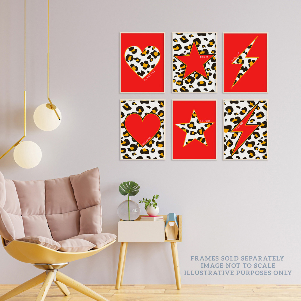 Infuse your space with the vibrant energy of the 'Leopard Pattern Bold Shapes Red Orange Wall Art Prints', a dynamic set of six unframed pieces that transform any room into a vivid gallery. Each print measures 30 x 41 cm, showcasing bold, abstract patterns in a striking red and orange palette, printed on luxurious thick art paper. Ideal for those looking to add a splash of colour and modernity, these prints are perfect for creating a focal point in living spaces, offices, or hallways.
