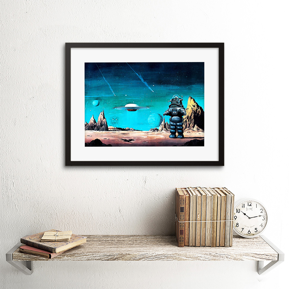 Celebrate the charm of classic cinema with the 'Film Robby Robot Forbidden Planet Space Stars' framed wall art print, a stellar addition to any room seeking a touch of vintage sci-fi flair. Crafted with superior materials and cutting-edge printing technology, this high-quality art print is encased in a stylish wooden frame that enhances its visual appeal. Measuring 30 x 41cm, it features a shatterproof styrene glass for added durability and safety. Whether you're a film buff or simply appreciate the aesthetics of old-school movie posters, this piece is sure to captivate and impress.