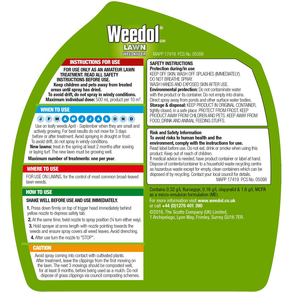 Keep your lawn weed-free with this Weedol Lawn Weed Killer. Pre-diluted and ready to use, it comes in an easy-to-use spray bottle - making it perfect for spot treatments. It's suitable for use on lawns for control of the most common broad-leaved weeds and works perfectly against dandelions, daisies, and clover without damage to your lawn.