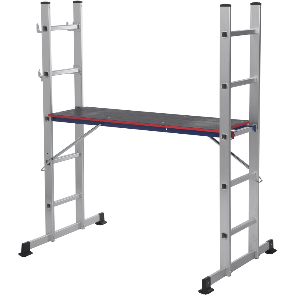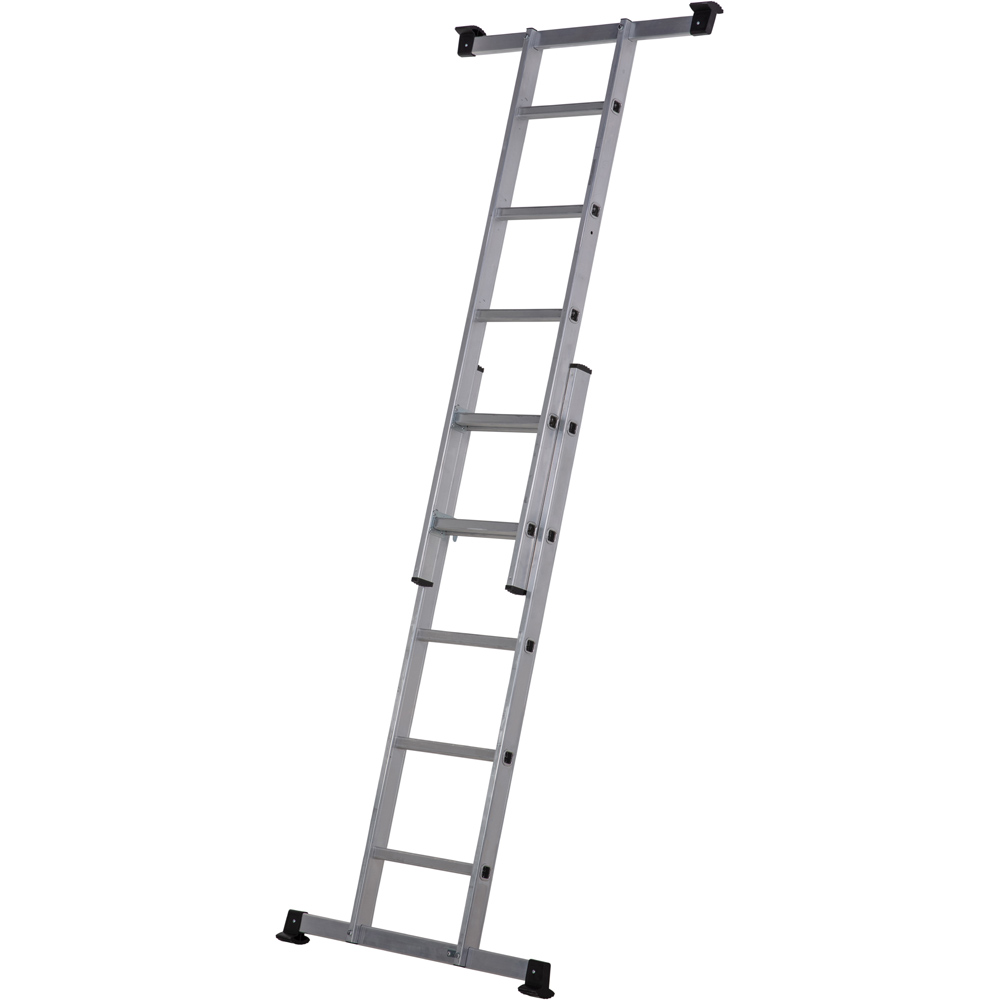 Upgrade yourself with the best with the Werner Five in One Combination Ladder. This heavy-duty ladder offers a large working platform for comfortable working areas, making it an ideal choice for working safely where work needs to be done around varied floor heights in places such as stairwells. With five positional modes in one design, the ladder features a sturdy locking bar for extra strength and security. It combines a stepladder, extension ladder, stairwell ladder, level platform and stairwell platform.
