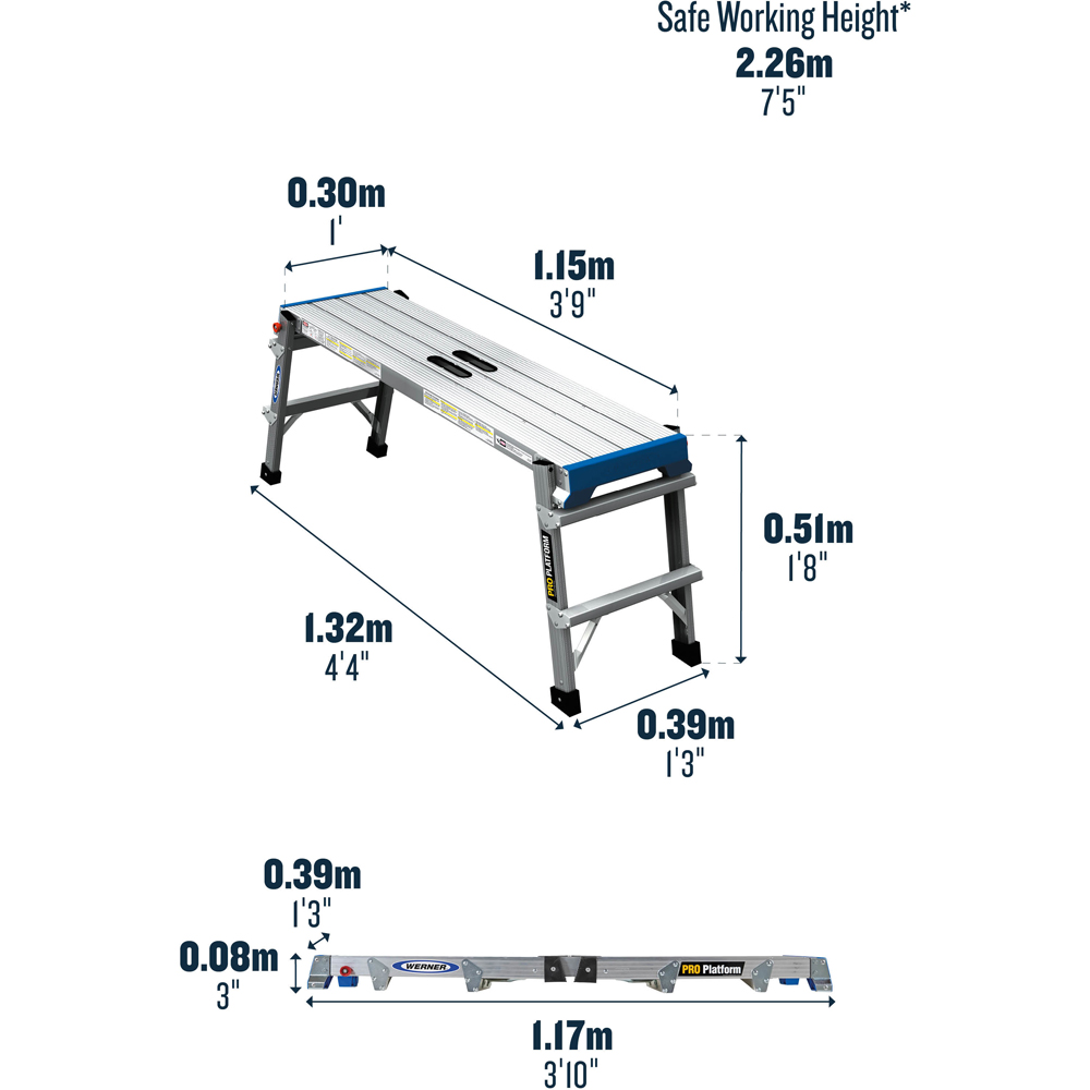 Upgrade yourself with the best with the Werner Compact Aluminium Pro Work Platform. The platform is an exceptional addition to any worksite, designed to cater to all types of jobs. It comes with a host of features that make it a reliable and safe working platform. The platform boasts an easy-grab handle that facilitates quick and effortless carrying, ensuring that you can easily move it around the worksite. Additionally, the platform has dual self-locking legs that provide a secure and stable base when opened, ensuring that you can work with confidence. The legs also lock automatically when closed, providing additional safety and security during storage. When not in use, the platform folds completely flat to a compact depth of 8cm, making it easy to store and transport.