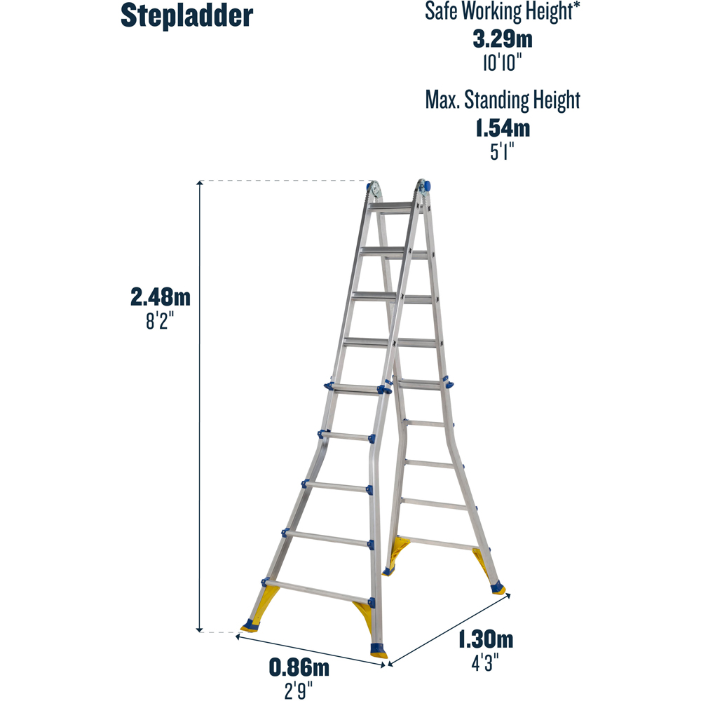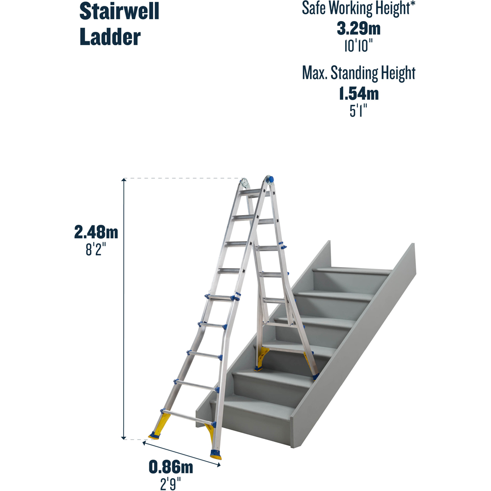 Complete your task safely while elevating your reach with the Werner Multipurpose Telescopic Ladder 2.48m. This ladder combines the functionality of a step ladder, stairwell ladder and extension ladder as it is engineered to provide a versatile solution for various tasks. It is crafted using sturdy, high-quality material with spring-loaded J locks that enable quick and easy adjustment to different heights. The telescopic design easily adjusts to 30 different working heights making it an ideal ladder for your toolkit.